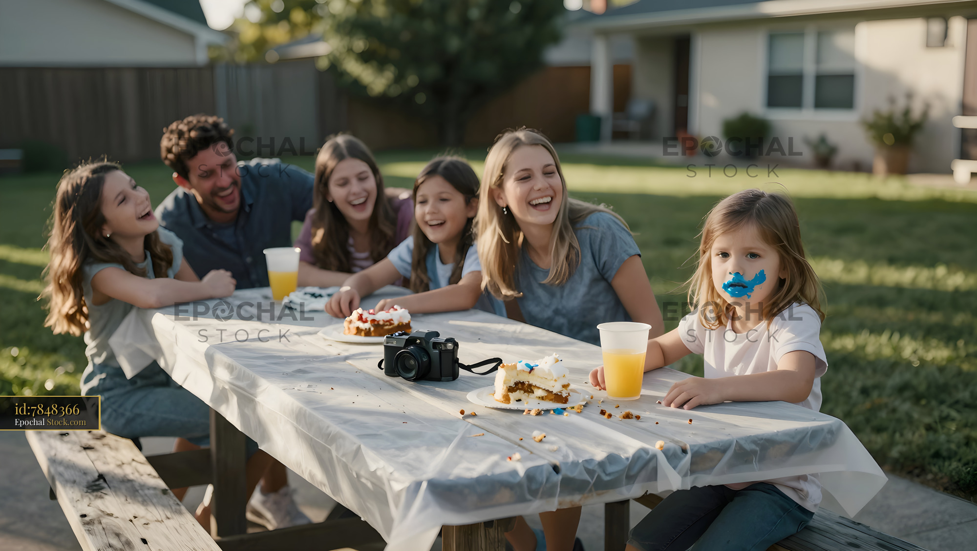 A group of friends sits around a table enjoying cake and drinks in a backyard. Laughter fills the air as they share fun moments together. One child has blue frosting on her face.