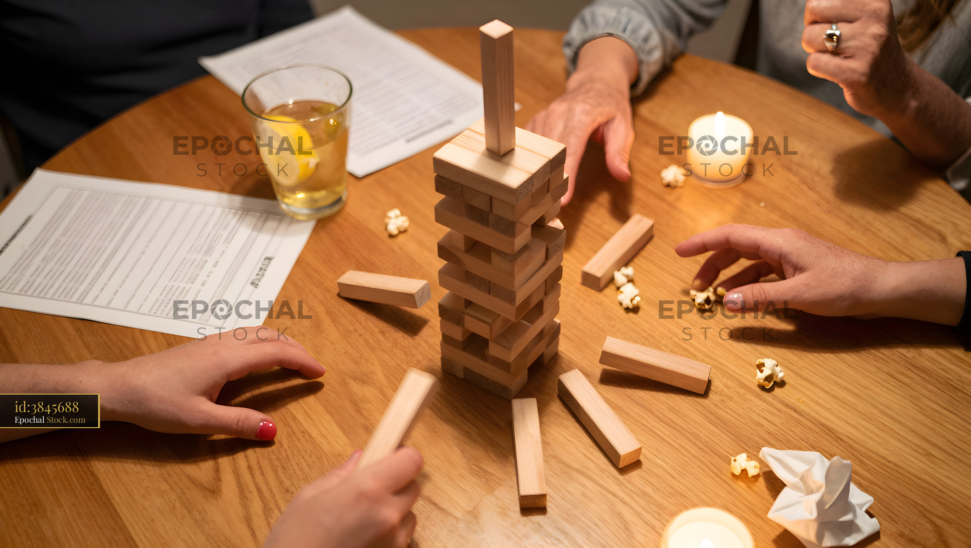 Friends play a stacking game with wooden blocks in a home setting Premium Stock Image