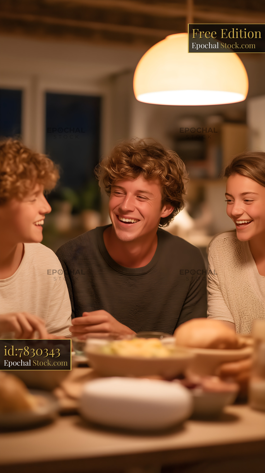 Three friends gather around a table filled with food. They laugh and enjoy each other's company in a warm kitchen setting during the evening.