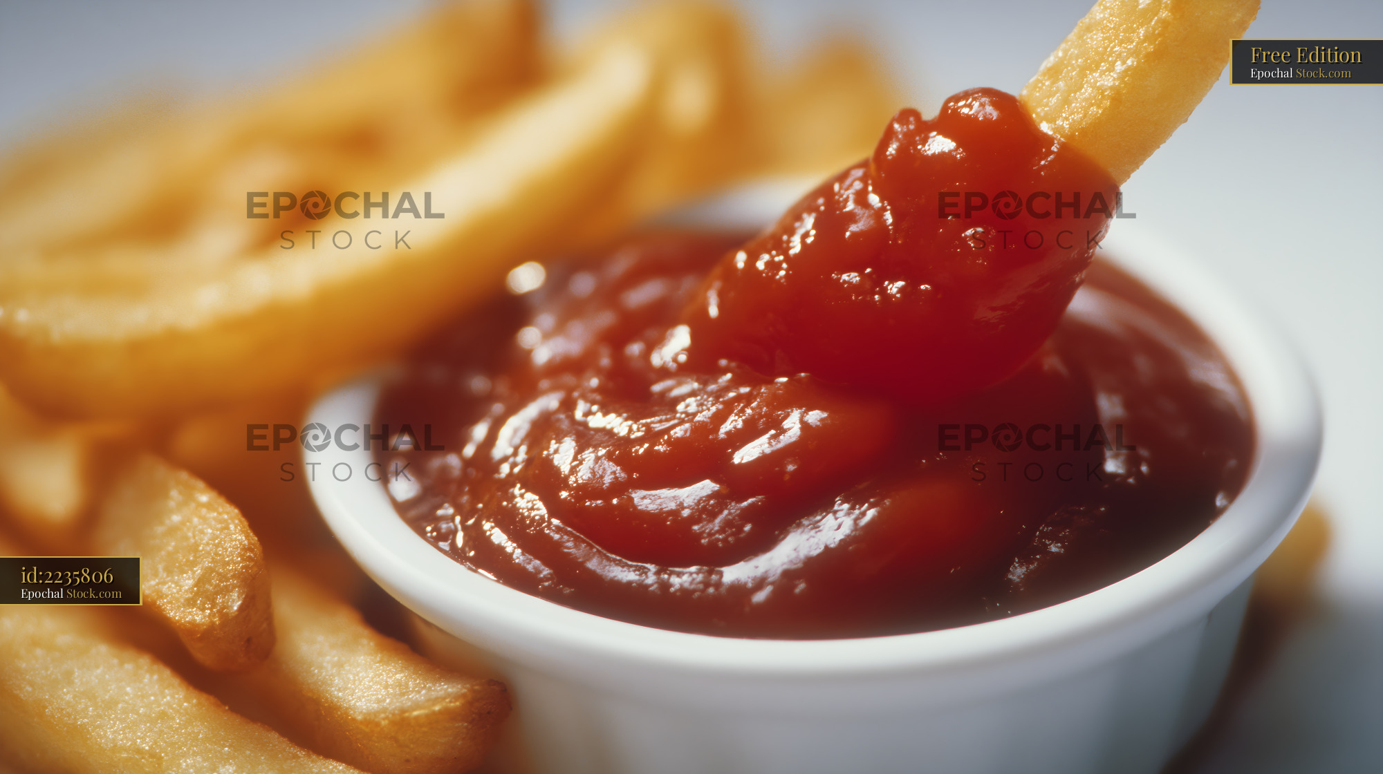 A plate holds crispy fries. One fry is dipped into a small bowl filled with red ketchup. This scene shows a common snack enjoyed at home or in fast food places.