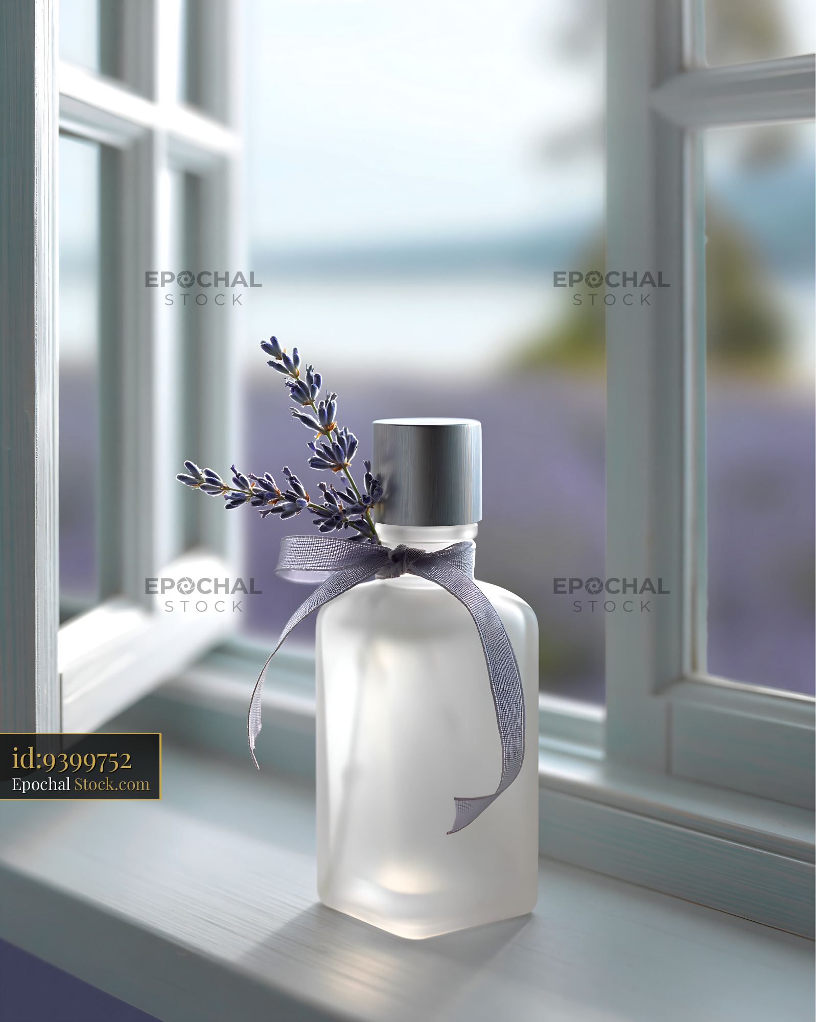 A minimalist frosted glass bottle decorated with a ribbon and fresh lavender stands on a bright windowsill, overlooking a blurred lavender field. This image evokes feelings of tranquility, natural beauty, and wellness.