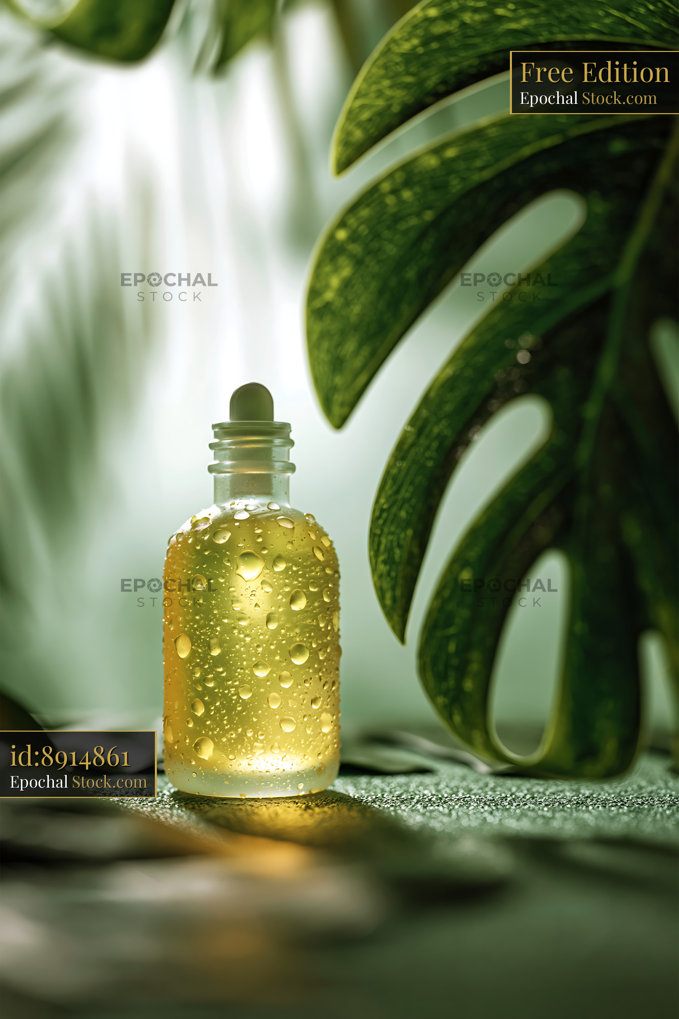 A frosted glass bottle containing golden essential oil, covered in fresh water droplets, placed against a lush monstera leaf with soft sunlight, evoking purity and natural wellness.