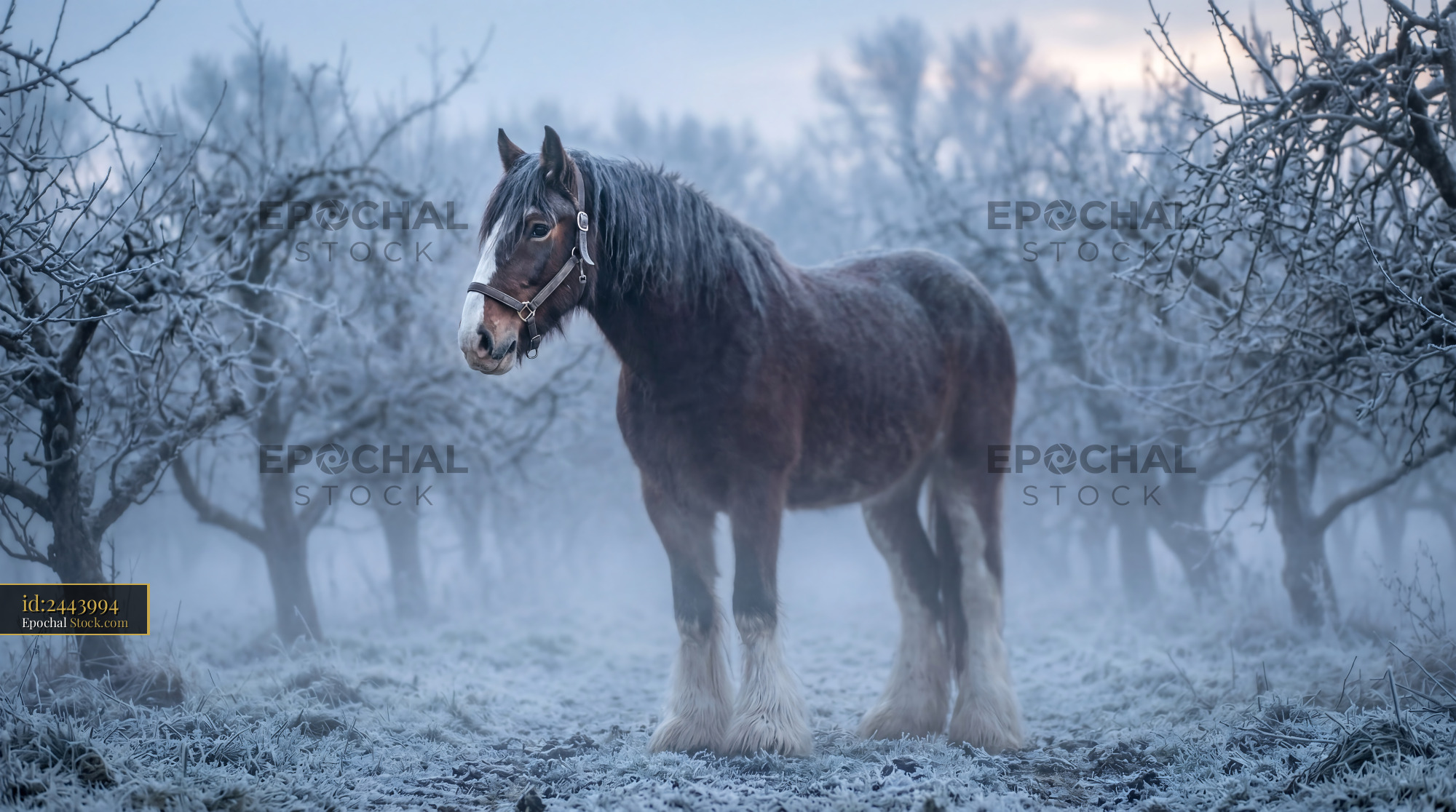 A serene seamless pattern of a Shire horse in a frozen orchard. Perfect for winter quilting, atmospheric wallpaper, or unique home decor with a cool, misty aesthetic.
