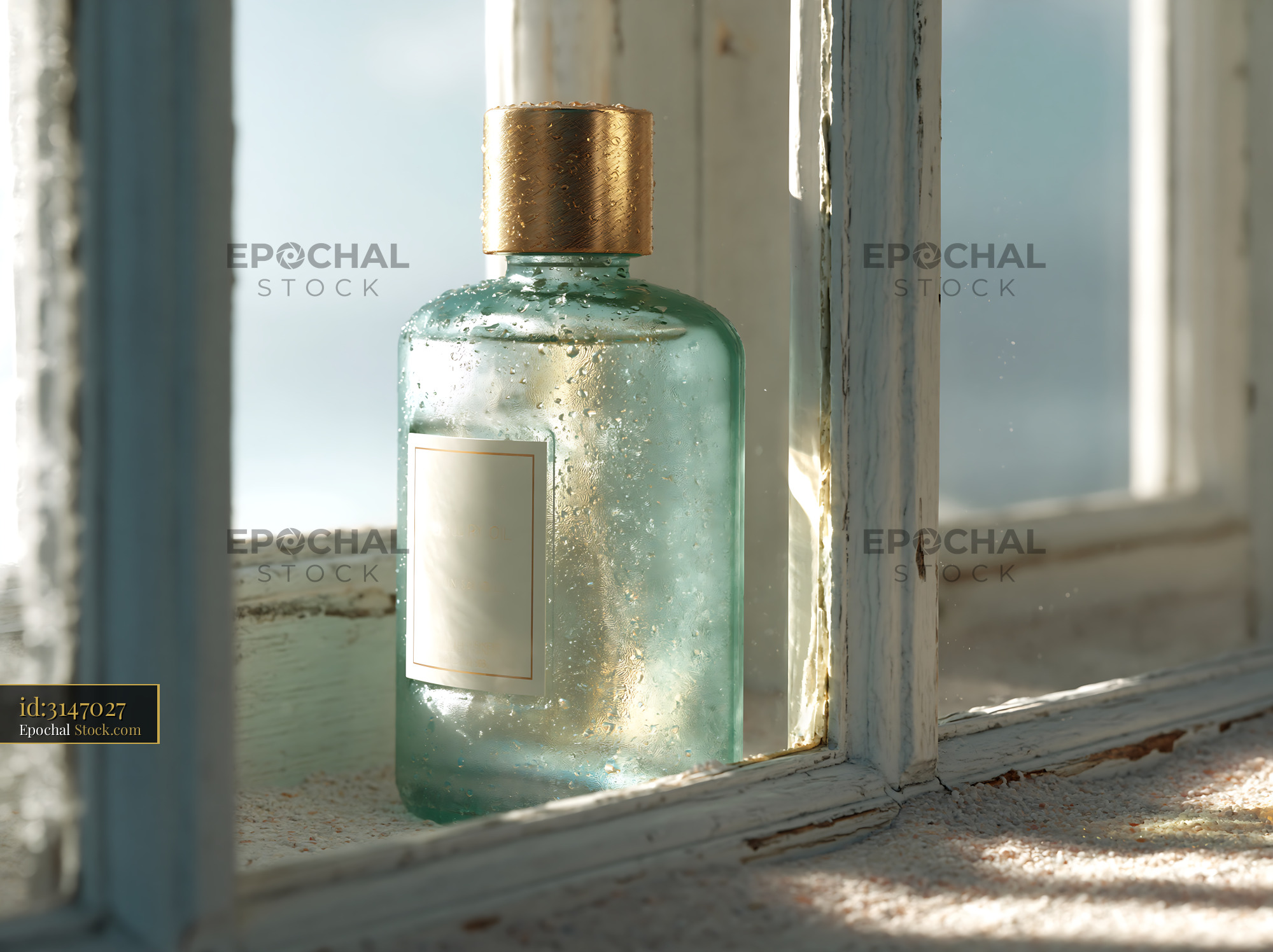 A luxurious teal glass bottle with golden cap covered in morning dew sits on a weathered white windowsill, capturing the essence of a refreshing coastal breeze and summer light.