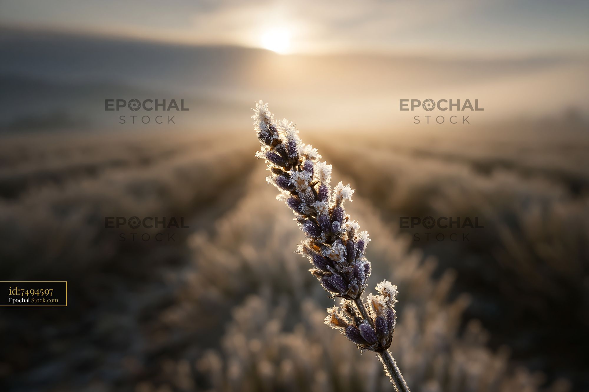 Frozen lavender sprig in a misty field at sunrise