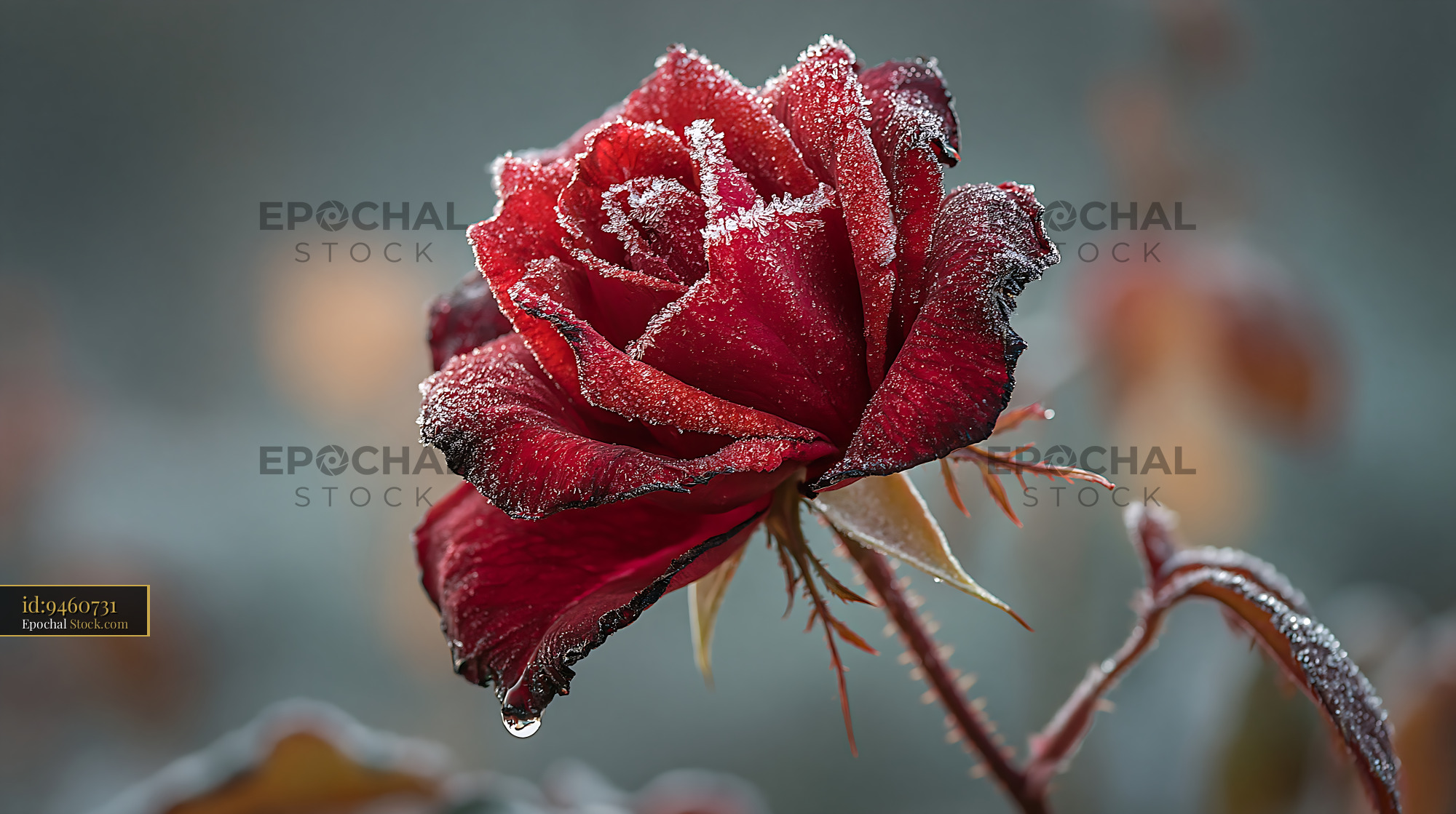 A dark red rose stands resilient against the first frost, covered in delicate ice crystals, capturing the melancholy beauty of the last rose of summer transitioning into winter.