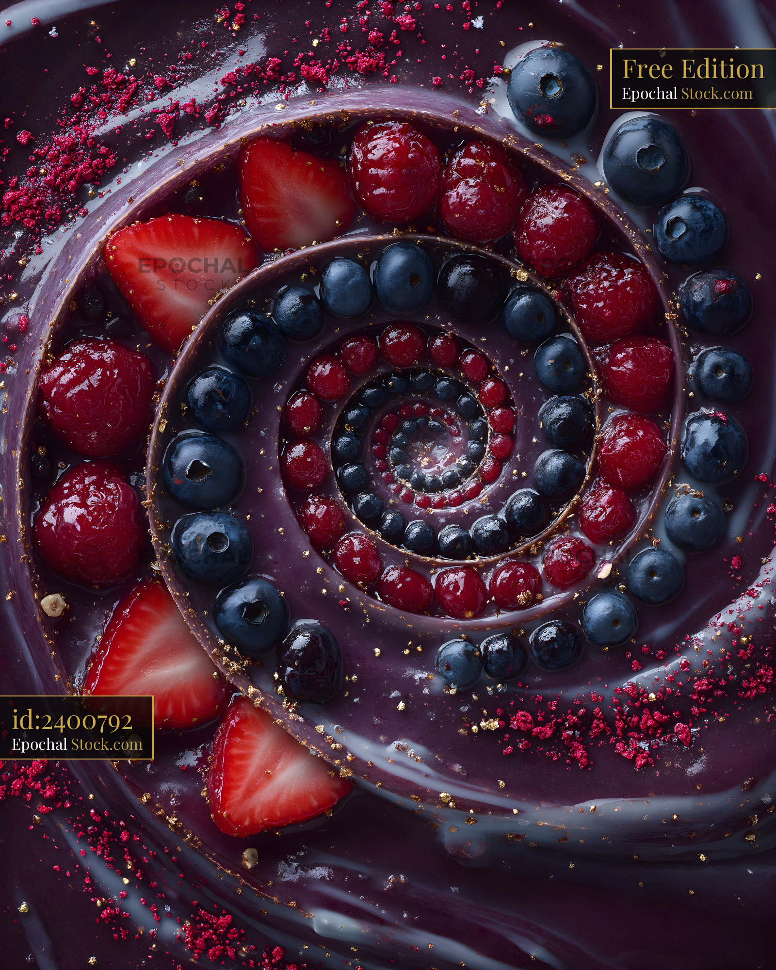 A spiral dessert made from dark chocolate is decorated with fresh strawberries, raspberries, and blueberries. Colorful patterns are visible on the surface of the dessert, creating an appealing design.
