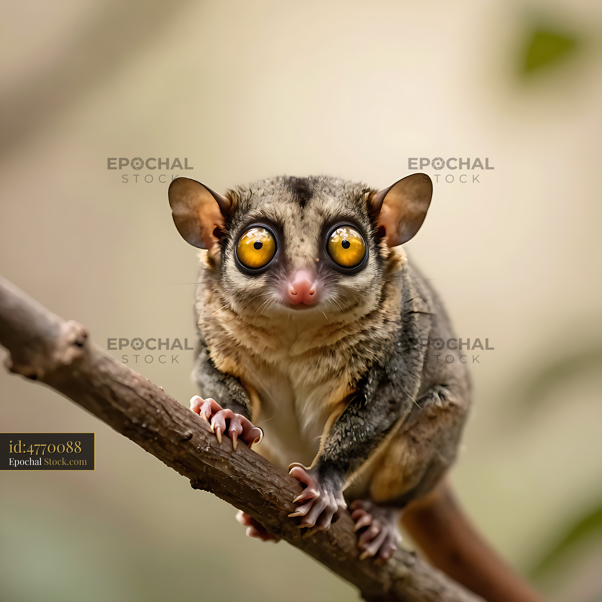 A close-up portrait of a small nocturnal galago or bushbaby, looking directly at the camera with wide, expressive golden eyes, highlighting the unique features of this wild primate in its natural habitat.
