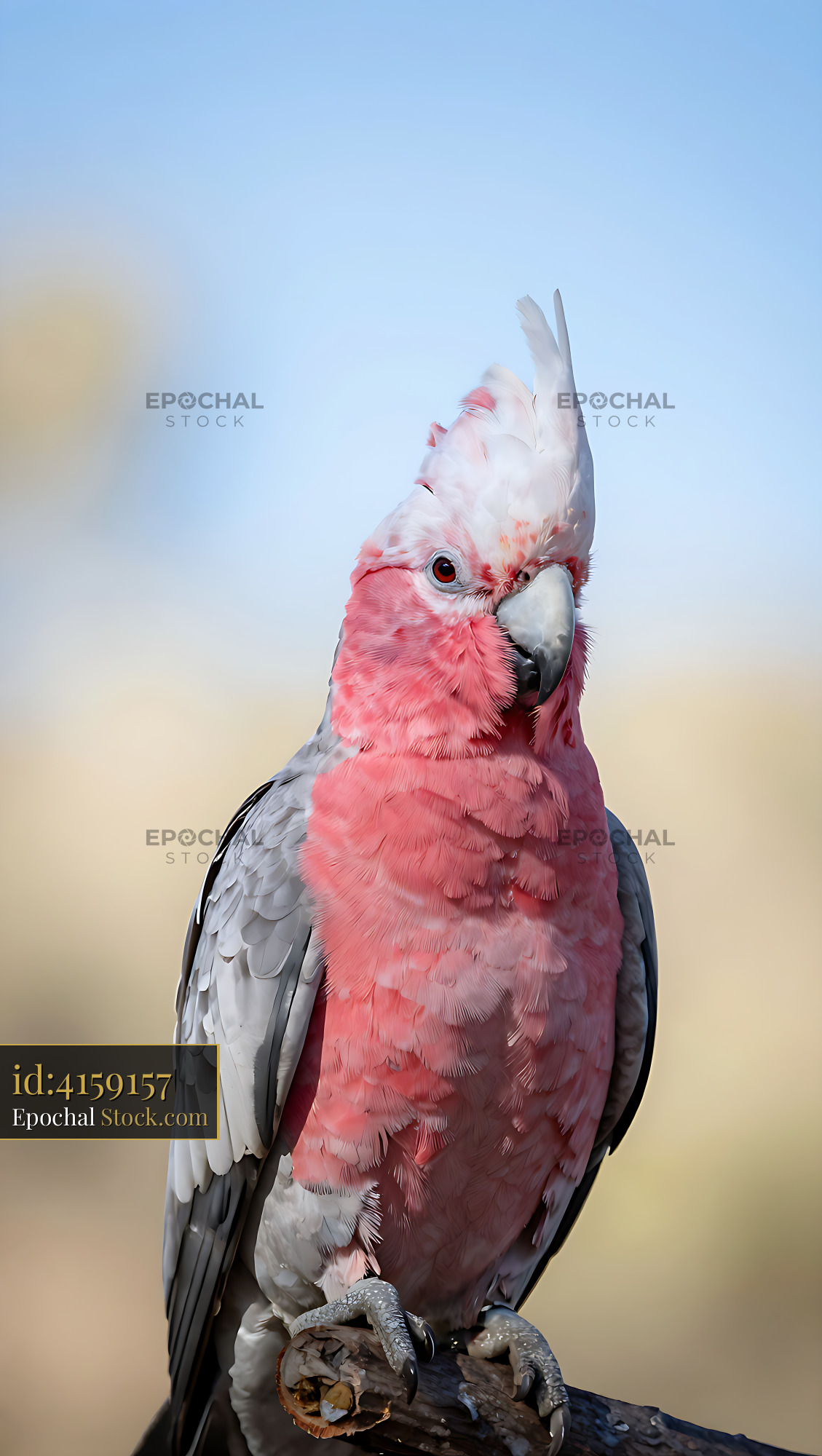 A vibrant rose-breasted cockatoo sits on a wooden branch, showcasing its beautiful pink plumage against a soft blue sky, symbolizing the colorful diversity of Australian wildlife.