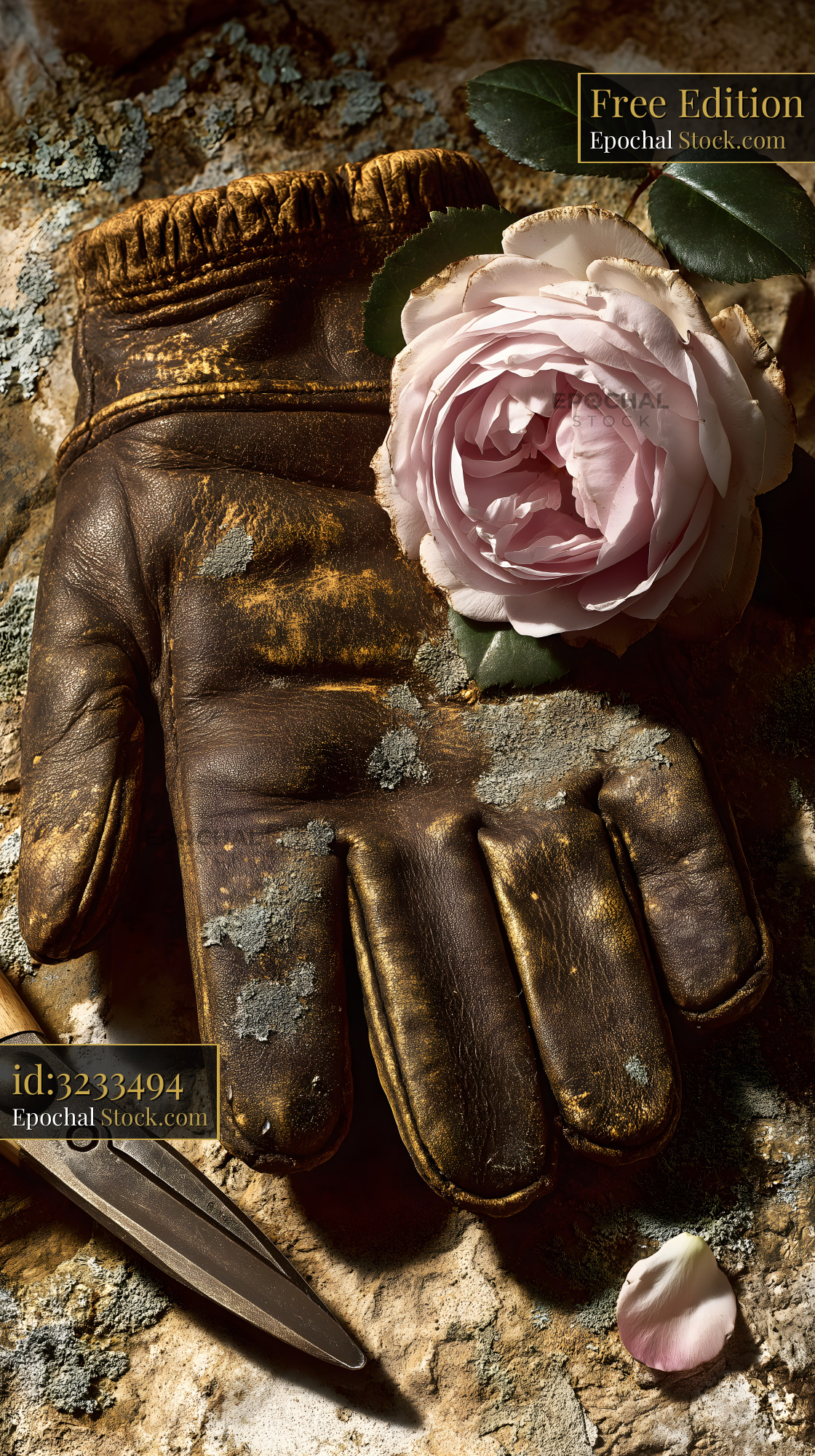 A worn garden glove lies on a stone surface. Next to it, there is a pink rose and a pair of shears. The setting has a rustic feel with some moss and peeling paint.