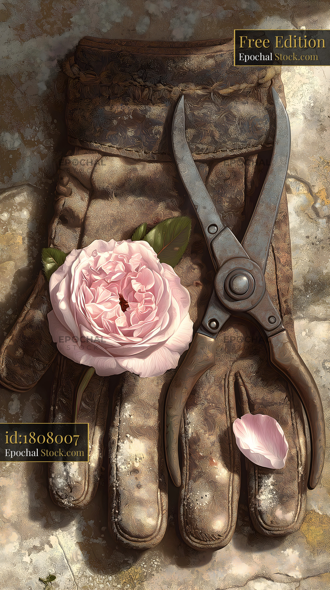 Garden tools and rose on a pair of gloves in spring Free Premium Stock Image