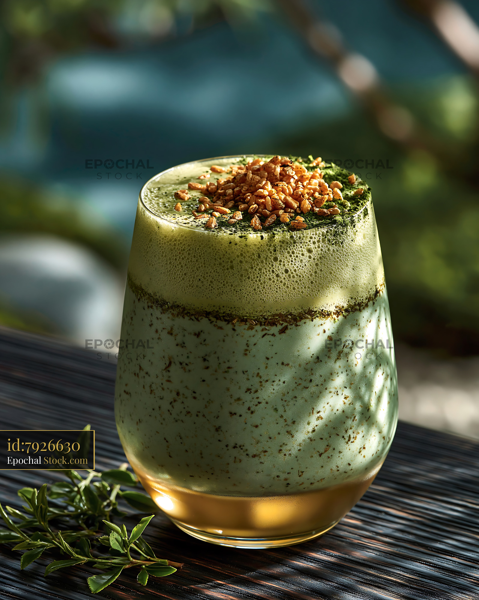 A refreshing genmaicha tea smoothie topped with roasted rice and matcha powder, served outdoors under dappled sunlight, evoking a sense of wellness and calm.
