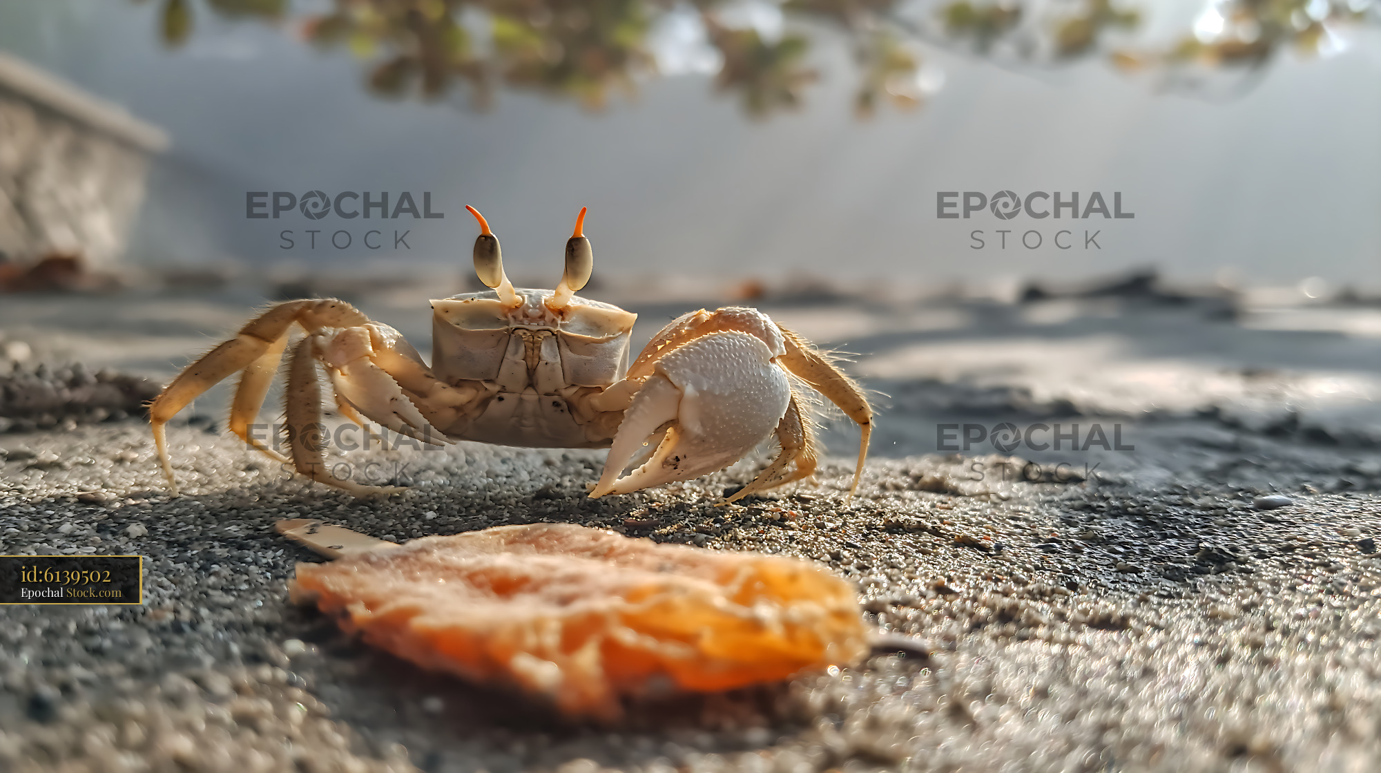 A detailed low-angle shot of a ghost crab on a sun-drenched beach, illustrating themes of wildlife survival, curiosity, and the delicate ecosystem of the coast.