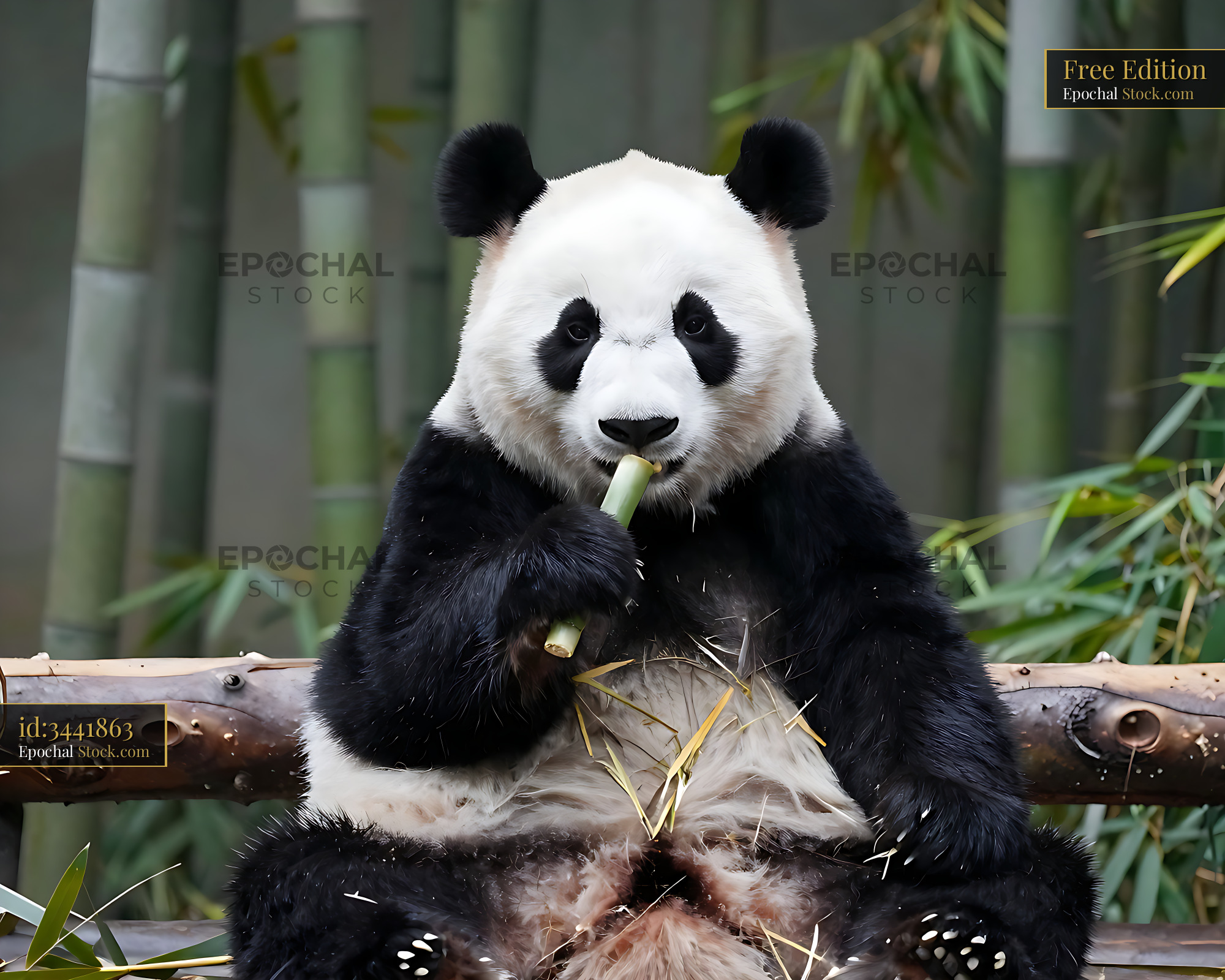 A majestic giant panda sits peacefully while eating a fresh bamboo stalk, capturing the essence of wildlife conservation, tranquility, and the natural beauty of endangered species.