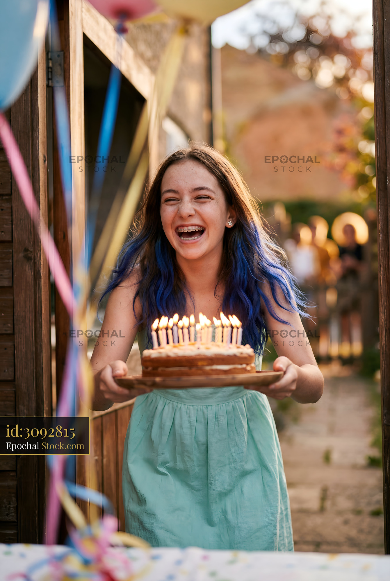 A girl with blue hair smiles widely while holding a cake with lit candles. She stands outdoors during a birthday party with friends in the background.