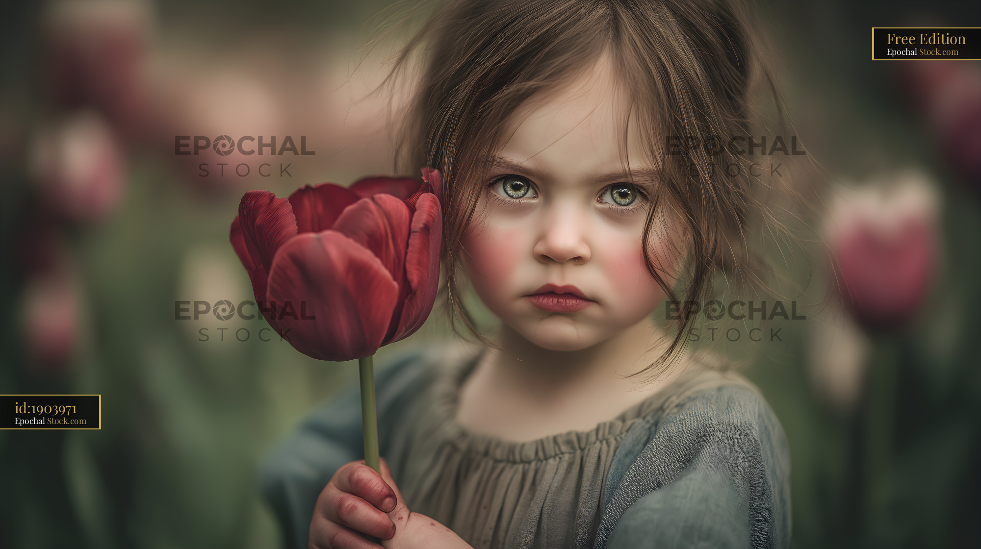 A young girl stands in a field filled with colorful tulips. She holds a red flower close and looks directly at the viewer. The scene captures the joy of springtime and nature's beauty.