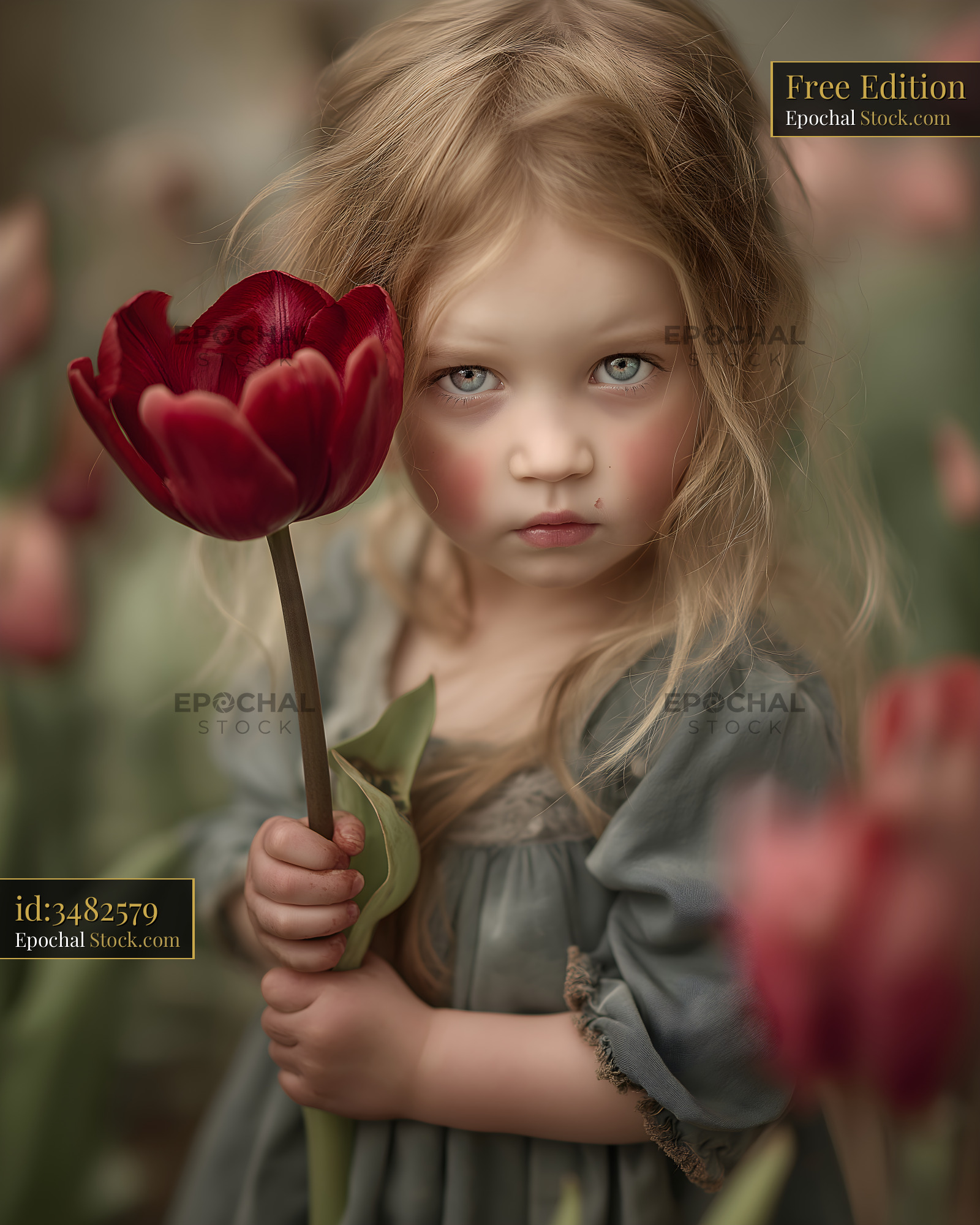 A girl stands in a field of tulips with a red flower in her hand. She has long hair and looks directly at the viewer. The bright colors of the tulips surround her as spring unfolds.
