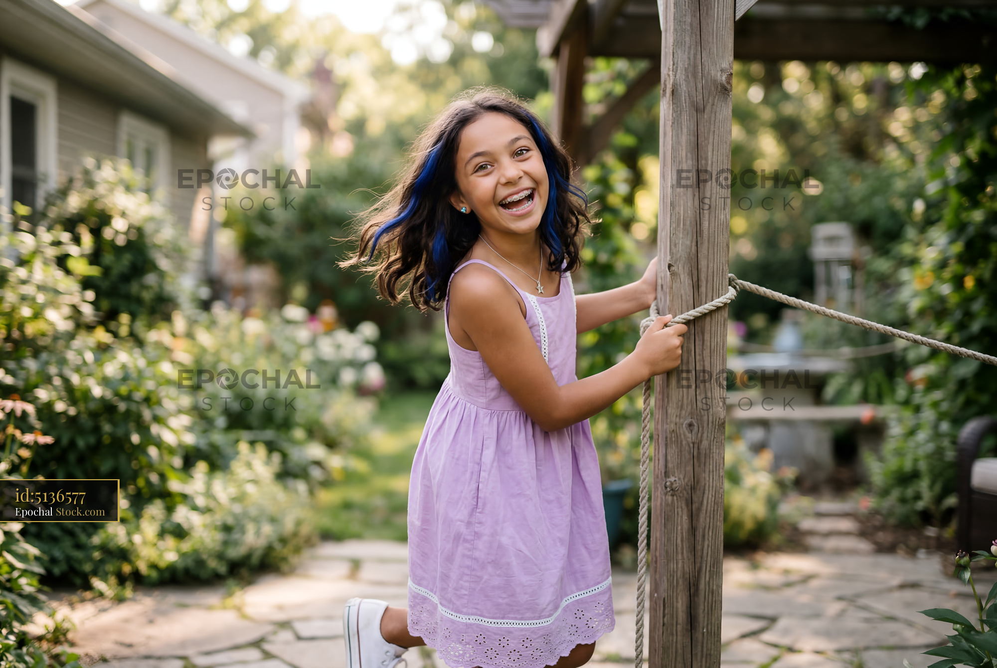 Girl plays on garden swing in sunny backyard in summer Premium Stock Image