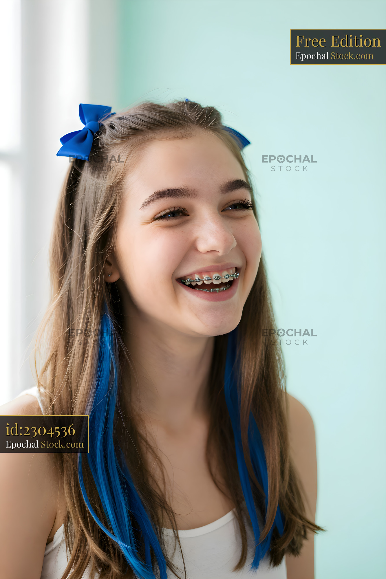 A young girl stands in a bright room with green walls. She has long hair with blue highlights and wears braces. She is smiling and looks happy while enjoying her moment.