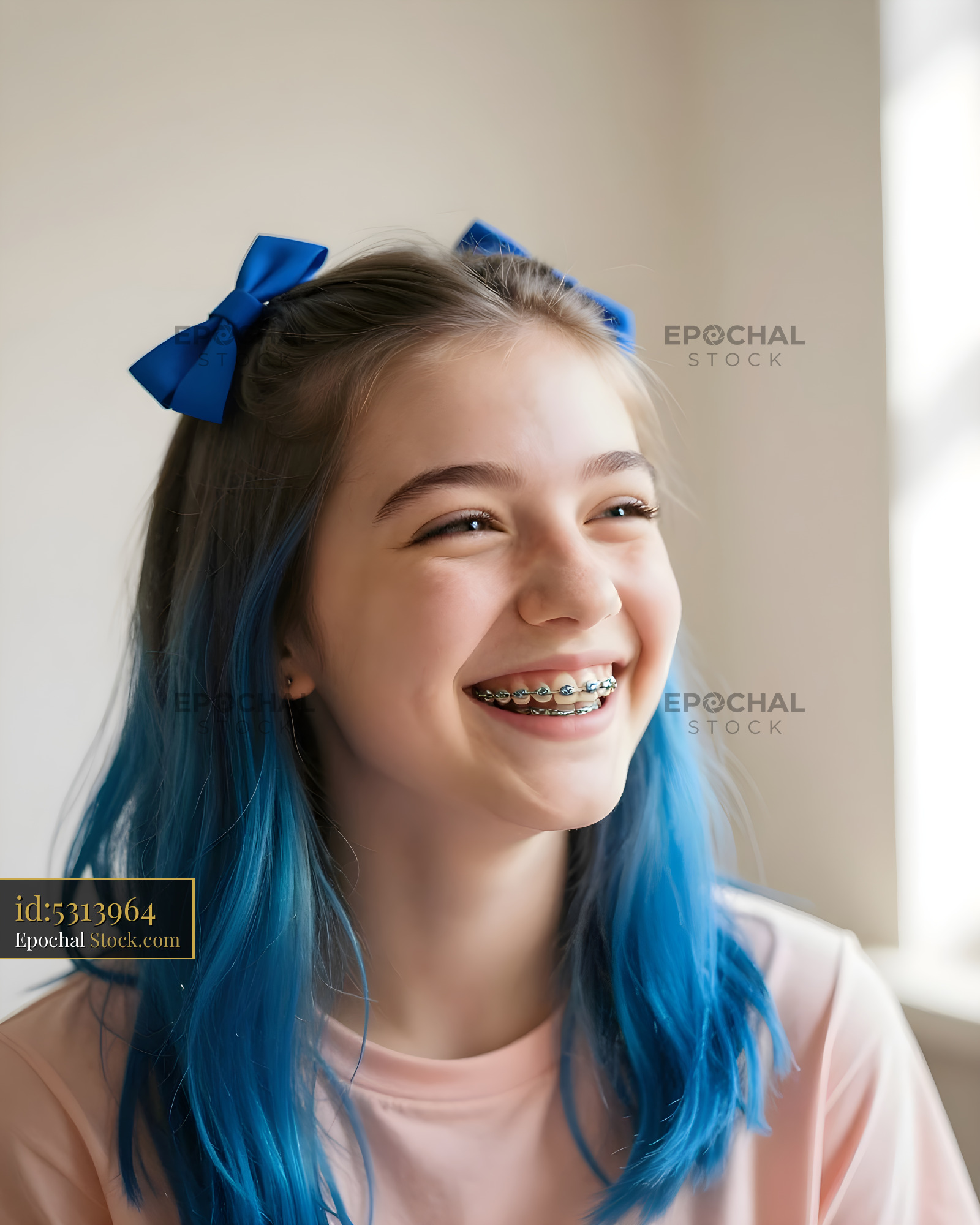 A girl with blue hair and blue bows sits indoors. She has braces on her teeth and is smiling. Sunlight comes in through the window, creating a bright atmosphere in the room.