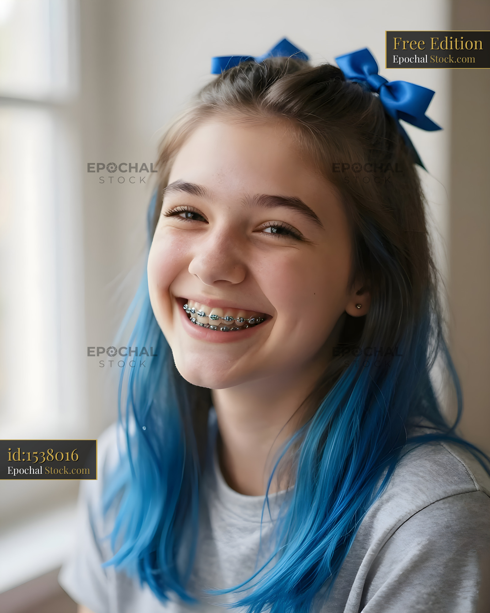 Girl with blue hair and braces smiles by the window Free Premium Stock Image