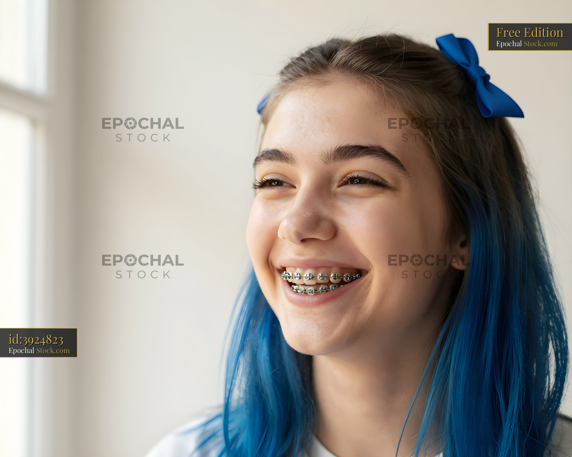 Girl with blue hair and braces smiles in bright room Free Premium Stock Photo