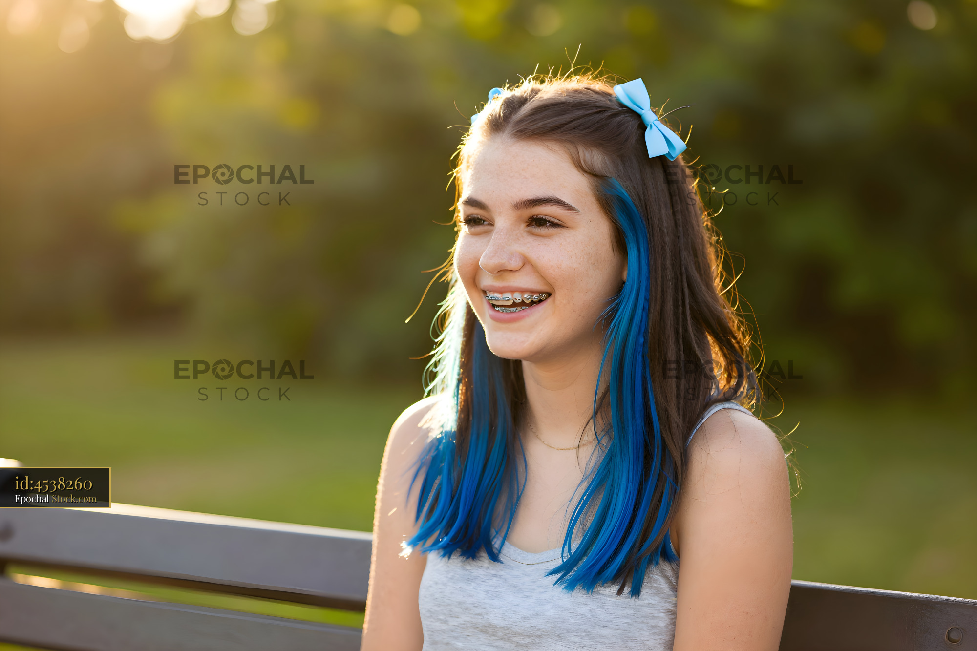 A girl with long blue hair sits on a bench in a park. She smiles and shows braces. Green trees and soft light surround her. It is a bright afternoon and she appears joyful.