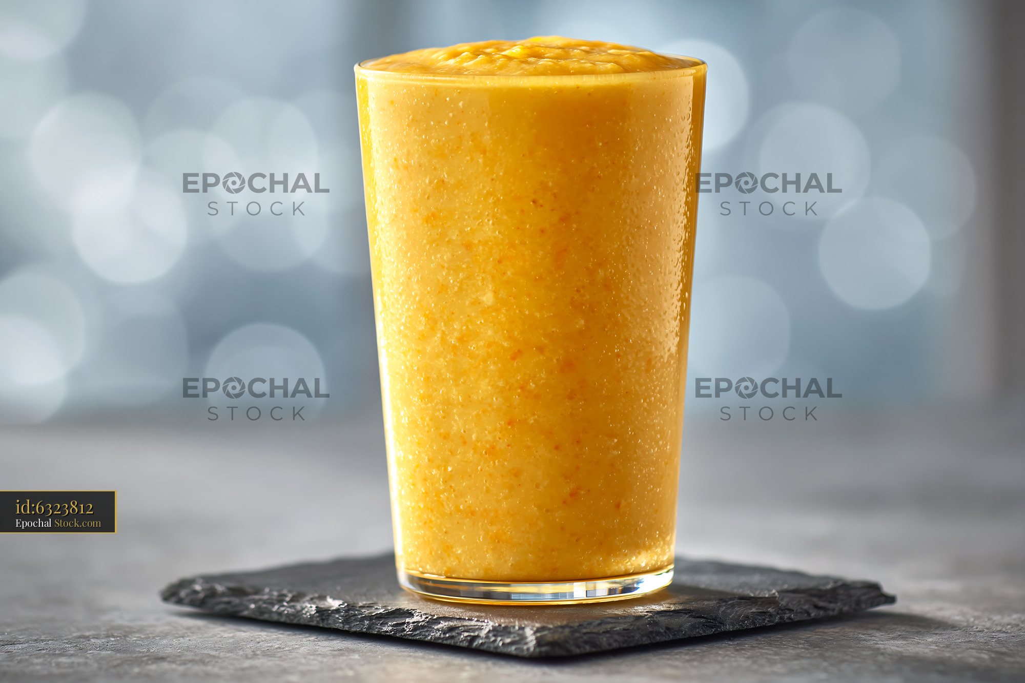 A tall glass filled with a creamy pawpaw punch milkshake sits on a dark slate coaster, capturing a sense of tropical refreshment and healthy indulgence.
