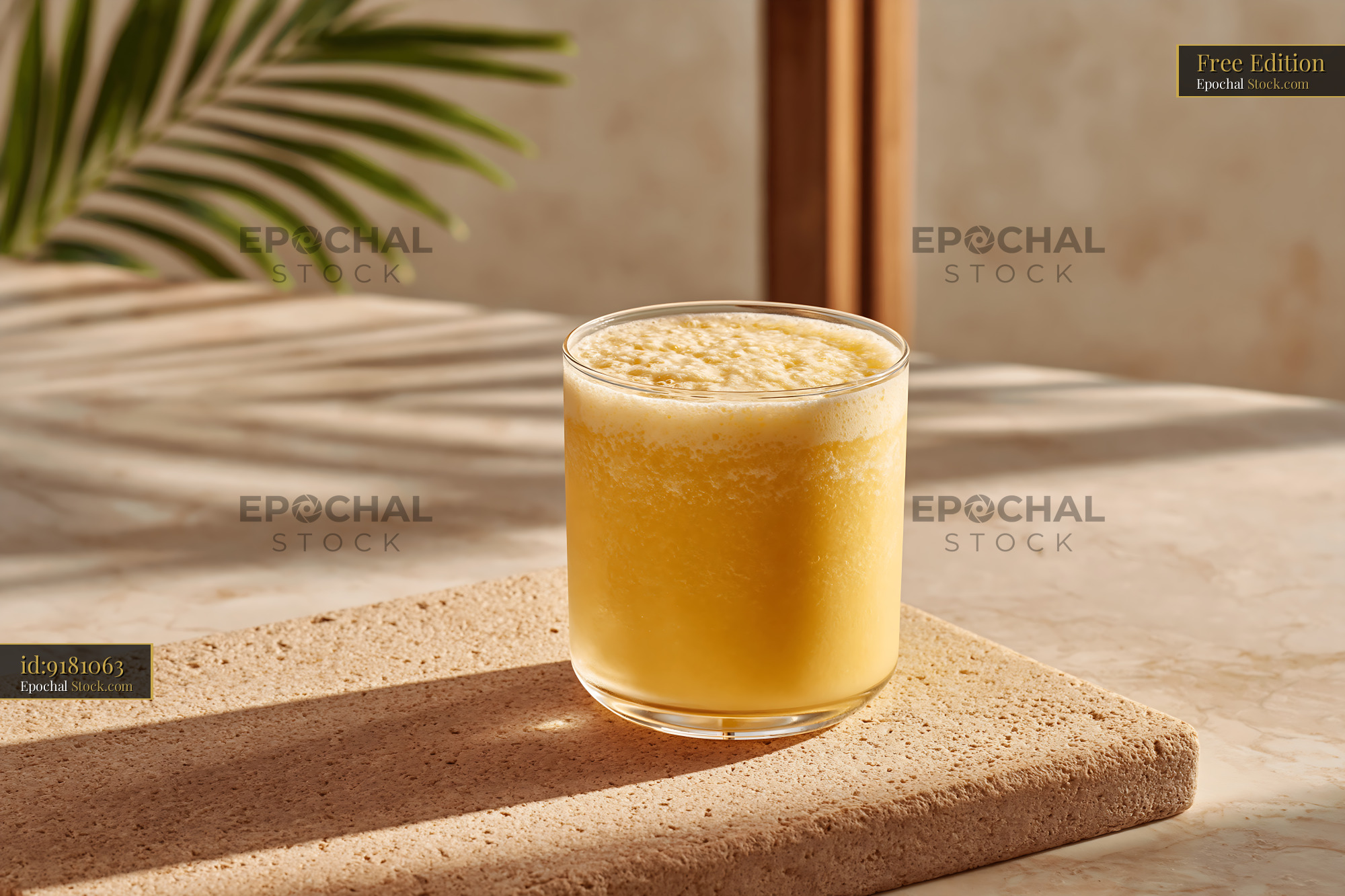 A chilled glass of creamy pawpaw punch milkshake sits on a textured stone coaster, bathed in warm sunlight with palm leaf shadows, evoking a tropical and relaxing summer mood.