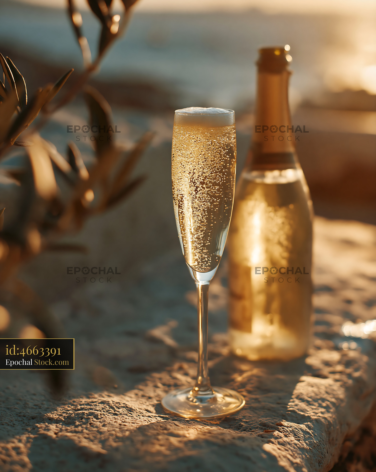 A chilled glass of sparkling wine captures the golden light of sunset on a rustic Mediterranean terrace, evoking a sense of celebration, luxury, and summer evening relaxation.