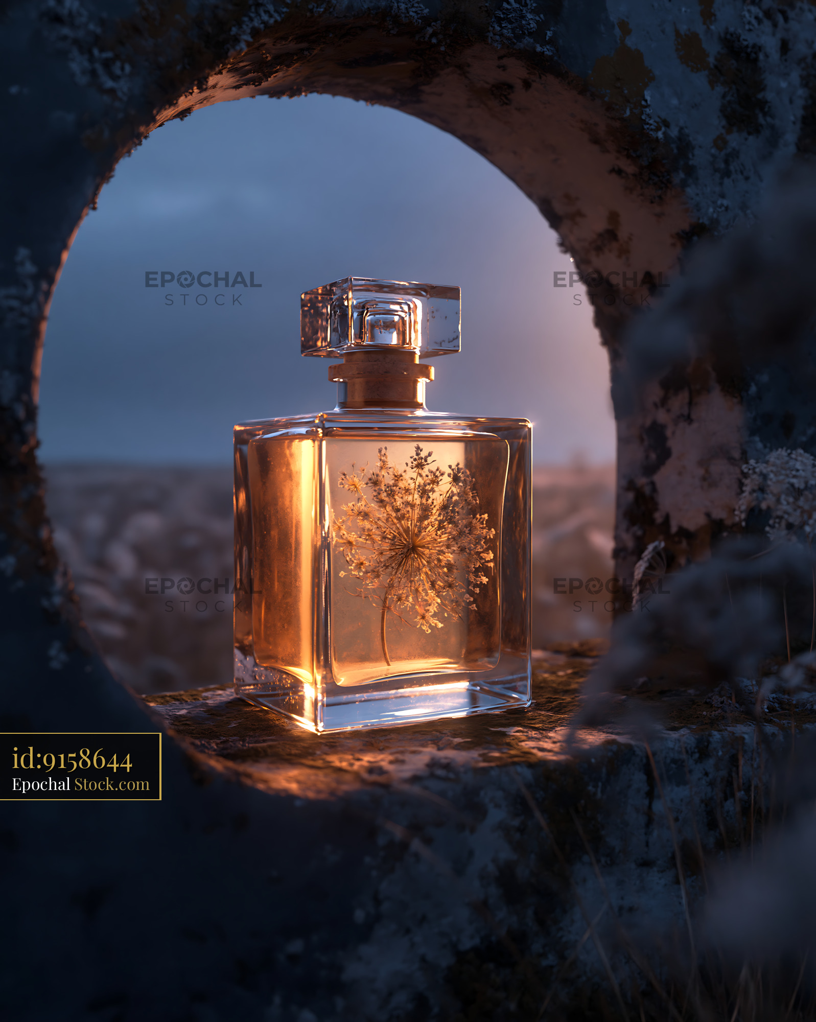 A glowing glass perfume bottle containing a dried botanical sprig sits within an ancient stone archway, capturing the warm light of a meadow sunset to evoke a sense of timeless elegance.