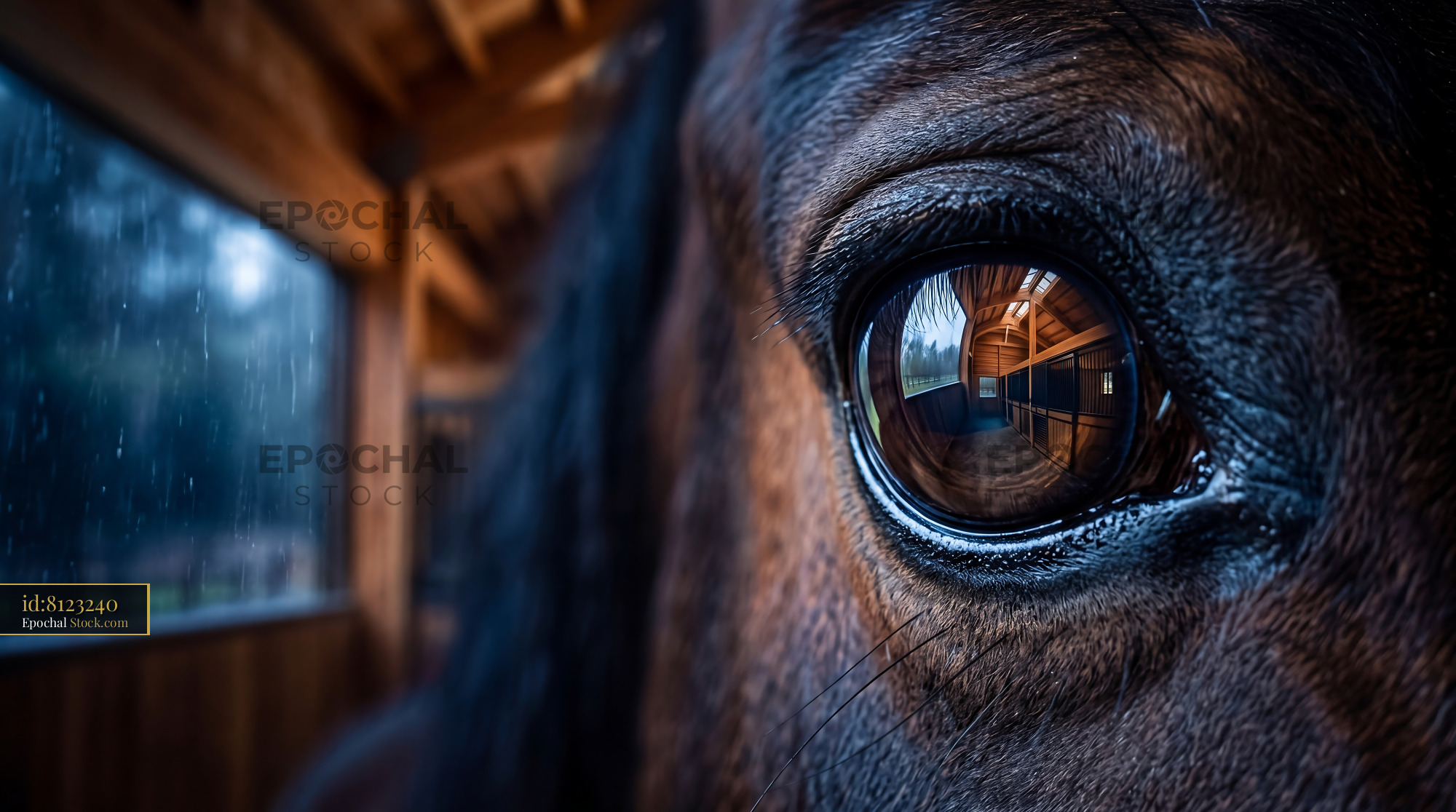 Hyper-realistic horse eye pattern featuring a warm stable reflection. Ideal for unique equestrian wallpaper, statement upholstery fabric, or dramatic gift wrap for animal lovers.