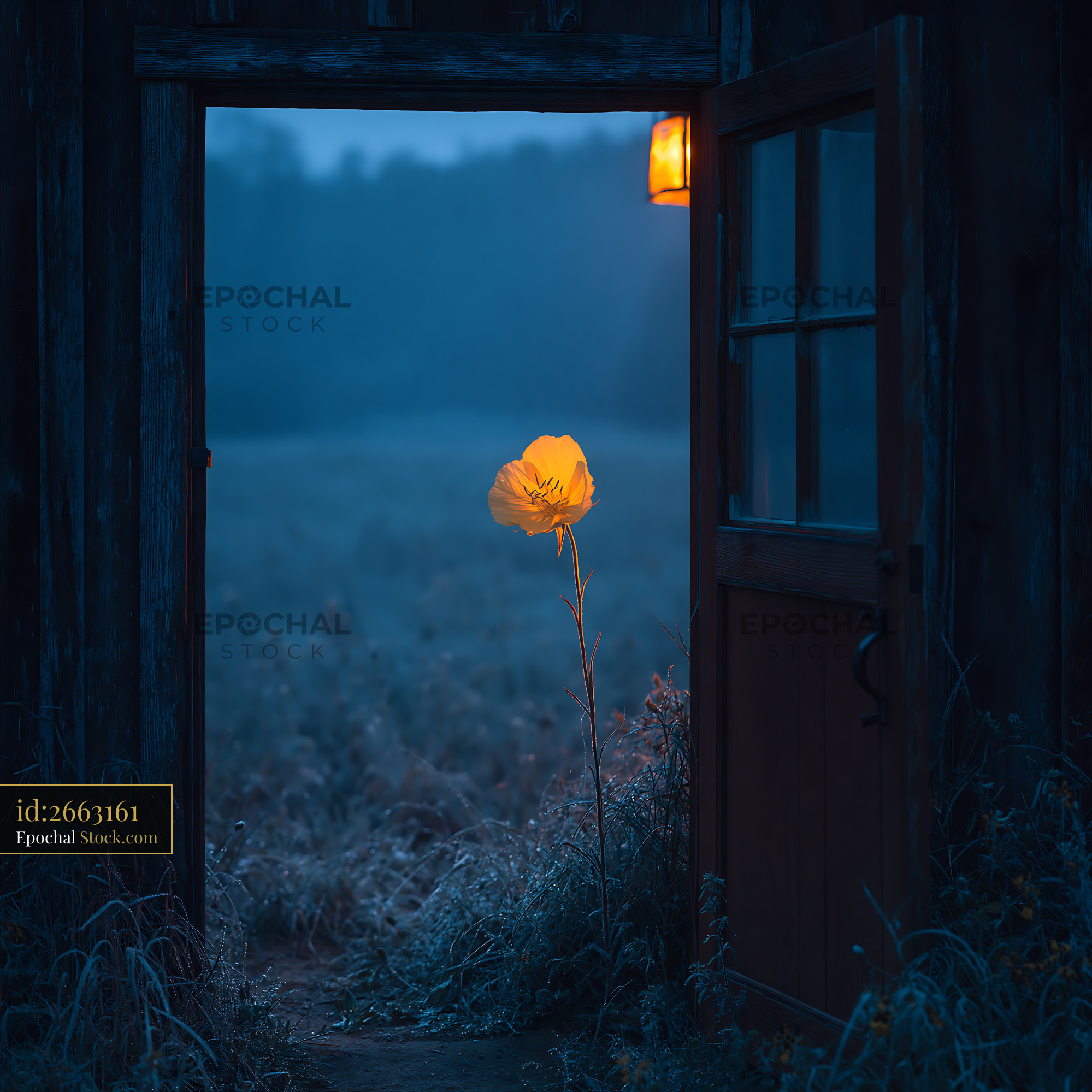 A luminous yellow flower stands at the threshold of an open wooden door, contrasting with the misty blue twilight, evoking themes of hope, resilience, and magical realism.