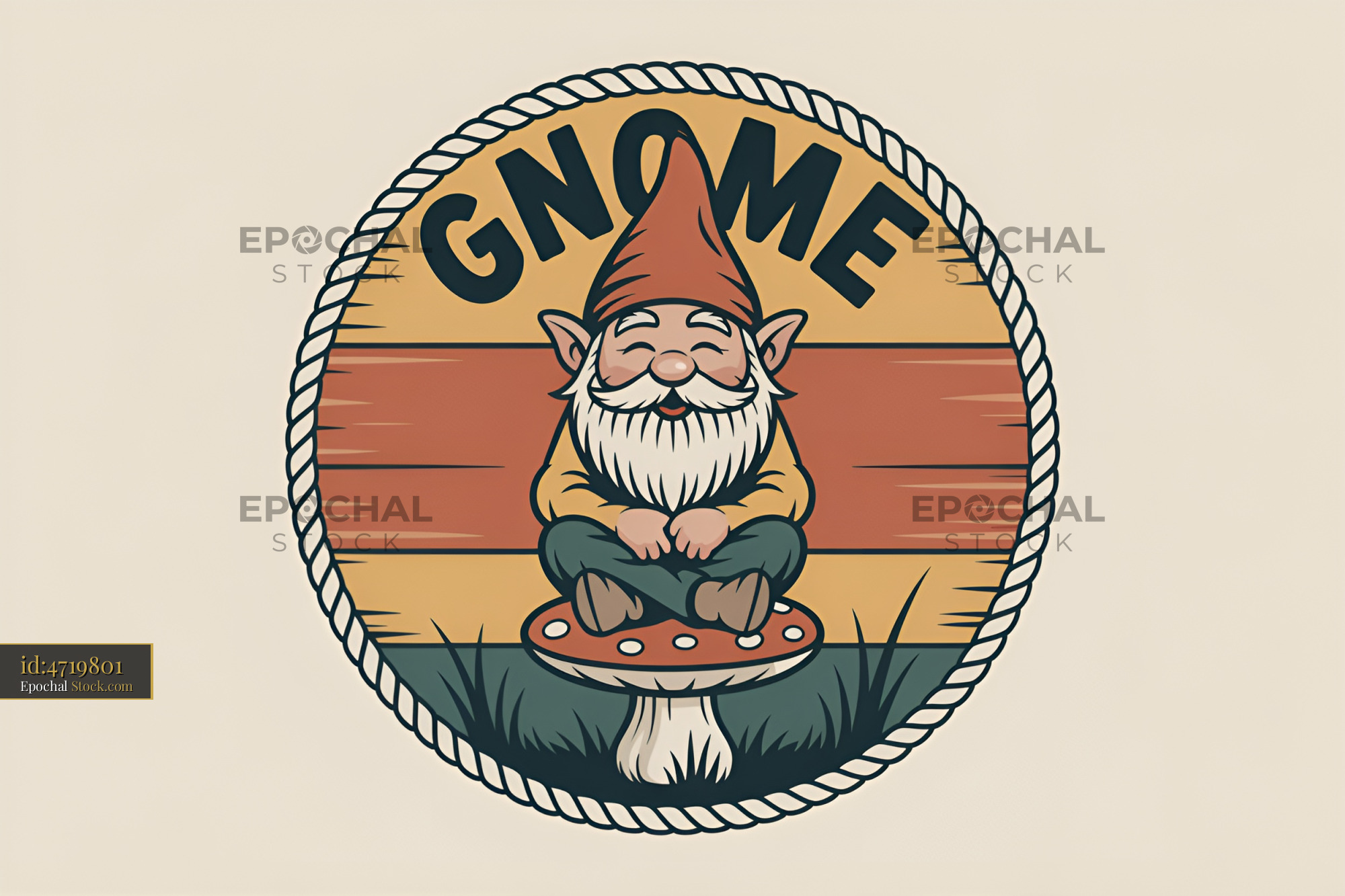 A gnome is sitting on a mushroom, smiling. The design features a rope border with the word Gnome above. This scene is simple and colorful, suitable for various uses.