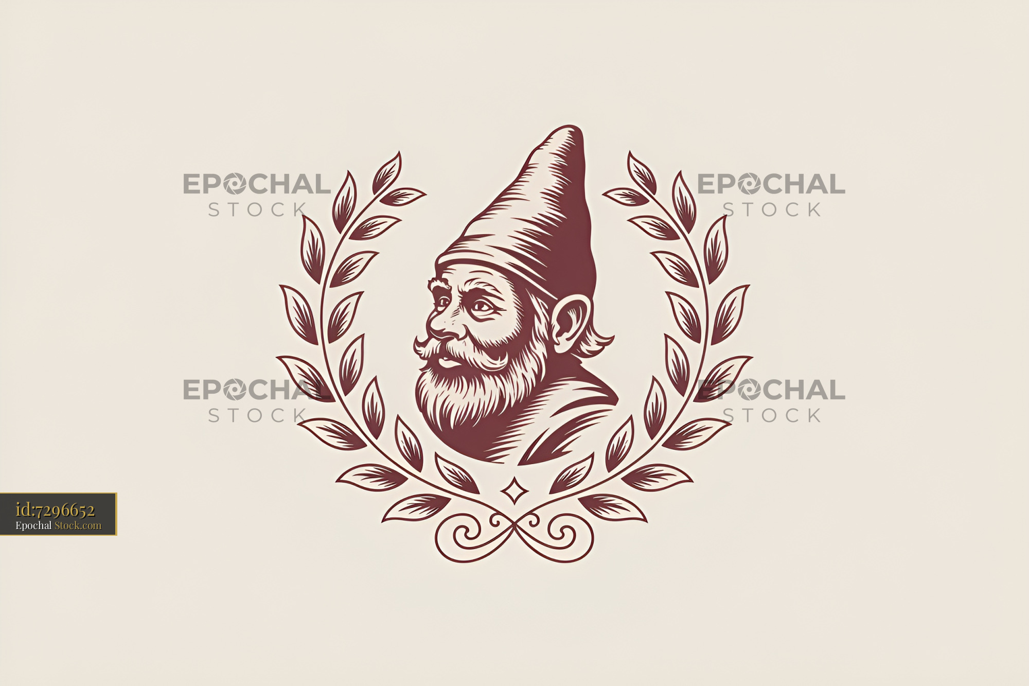 A gnome with a long beard wears a pointed hat. The gnome's face is surrounded by a wreath made of leaves. The style is simple and clear. This design shows a classic character.