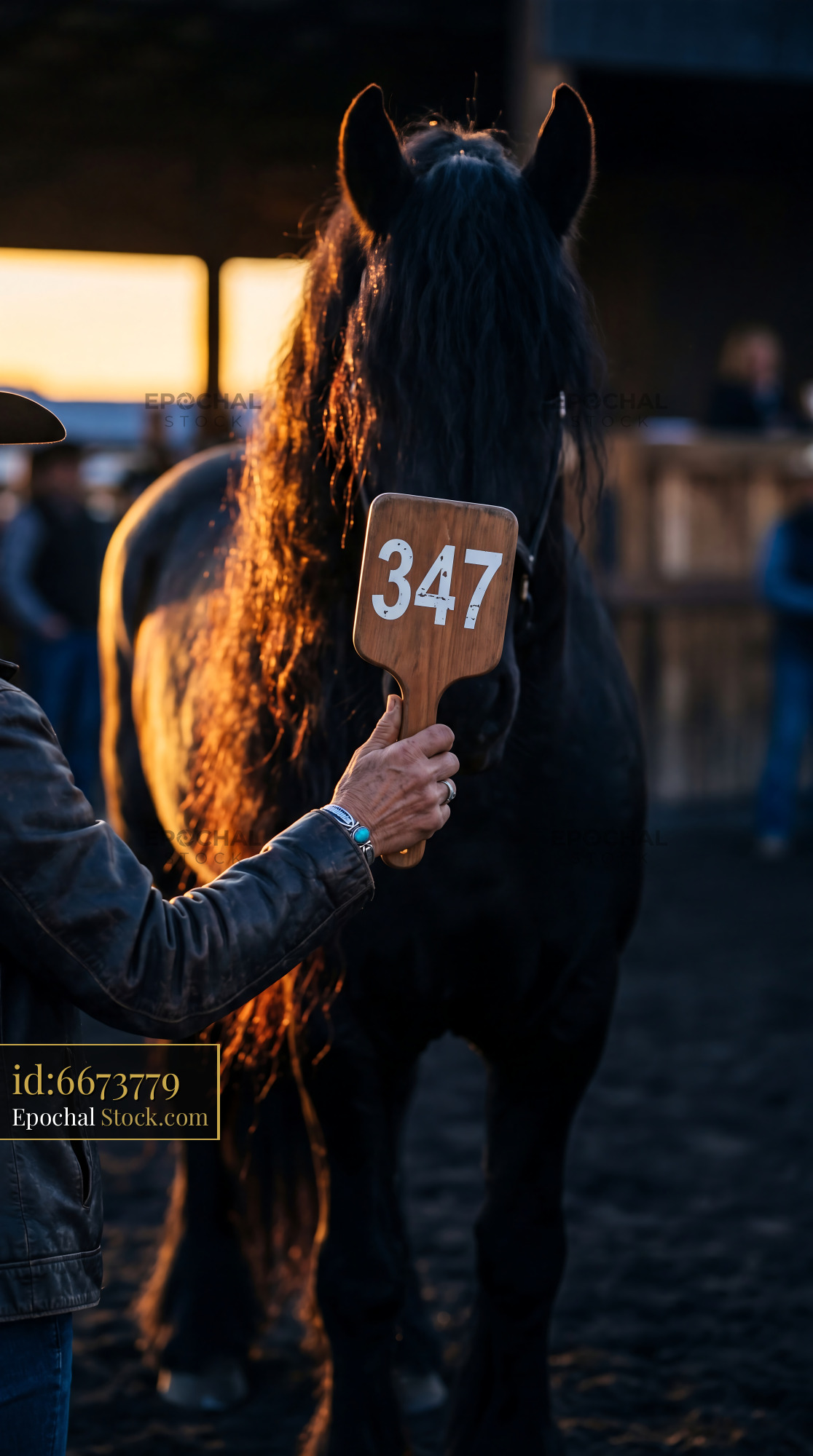 Dramatic equine photography featuring a Friesian stallion and bidding paddle. Perfect for western-themed quilting, rustic home decor, or unique gift wrap for horse lovers.