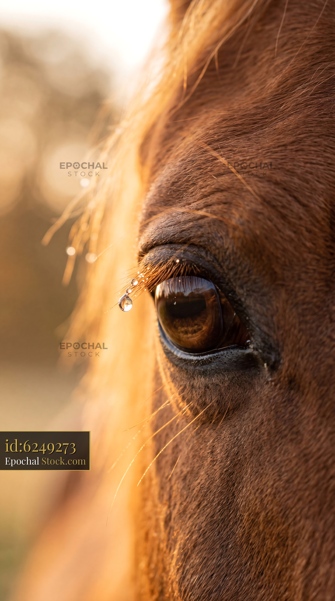 An intimate extreme closeup of a chestnut horse eye with morning dew on golden lashes. Perfect for equestrian home decor, unique statement wallpaper, or rustic quilting projects.
