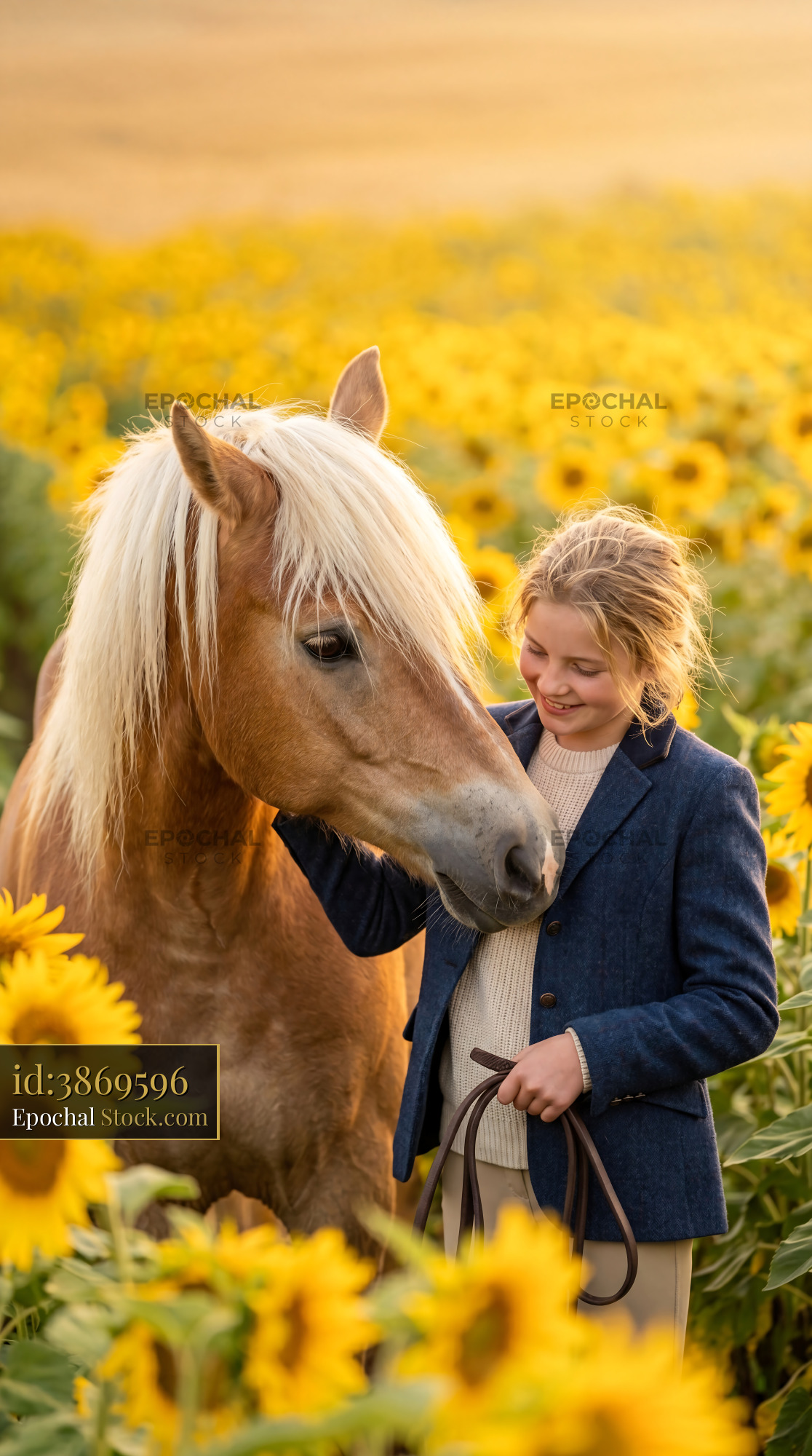 A warm equine photograph of a gentle Haflinger horse nuzzling a young girl in a sunflower field. Ideal for equestrian nursery wallpaper, quilting fabric, and rustic home decor.