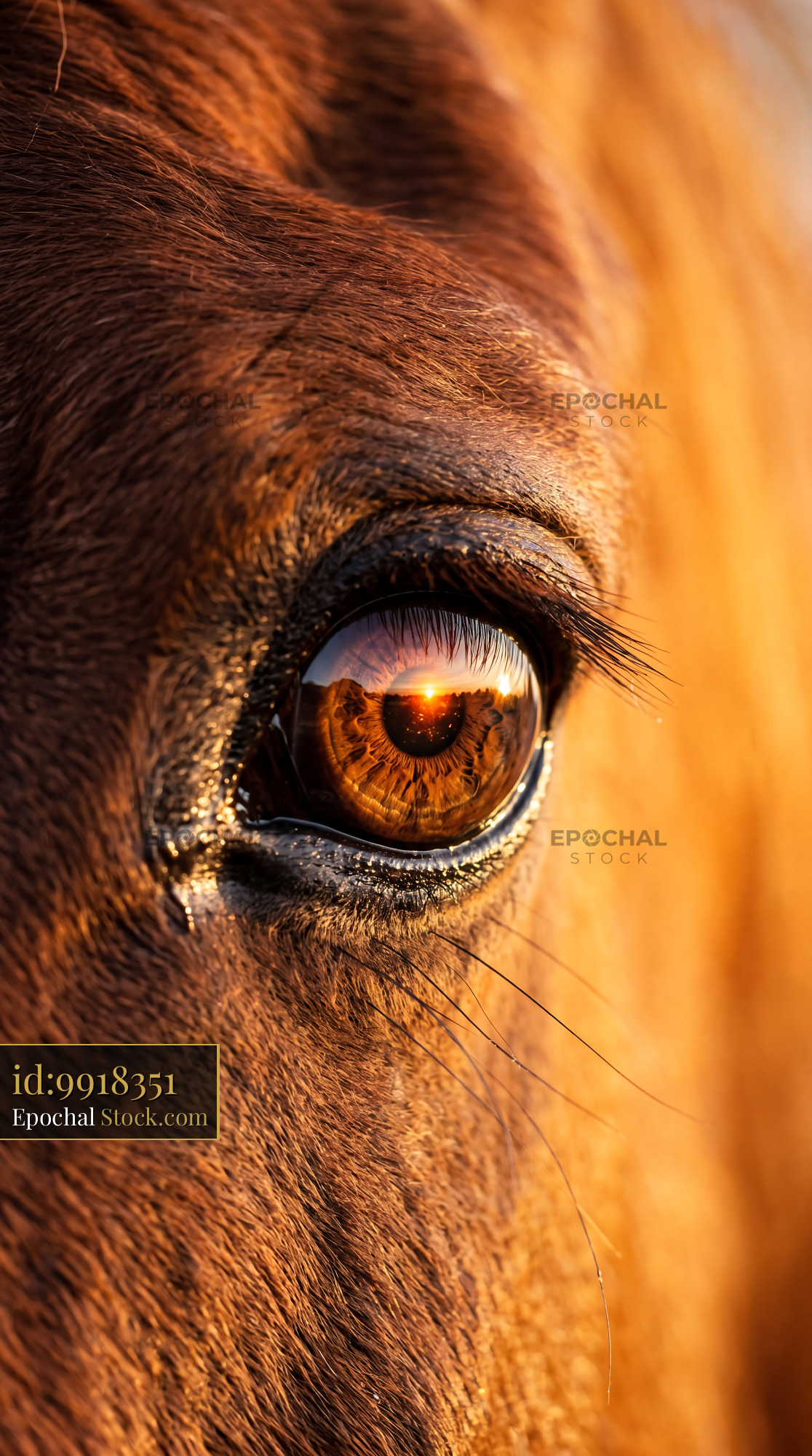 This stunning macro photography pattern features a chestnut horse's eye reflecting a golden sunrise. Perfect for unique home decor, statement wallpaper, or custom upholstery projects.