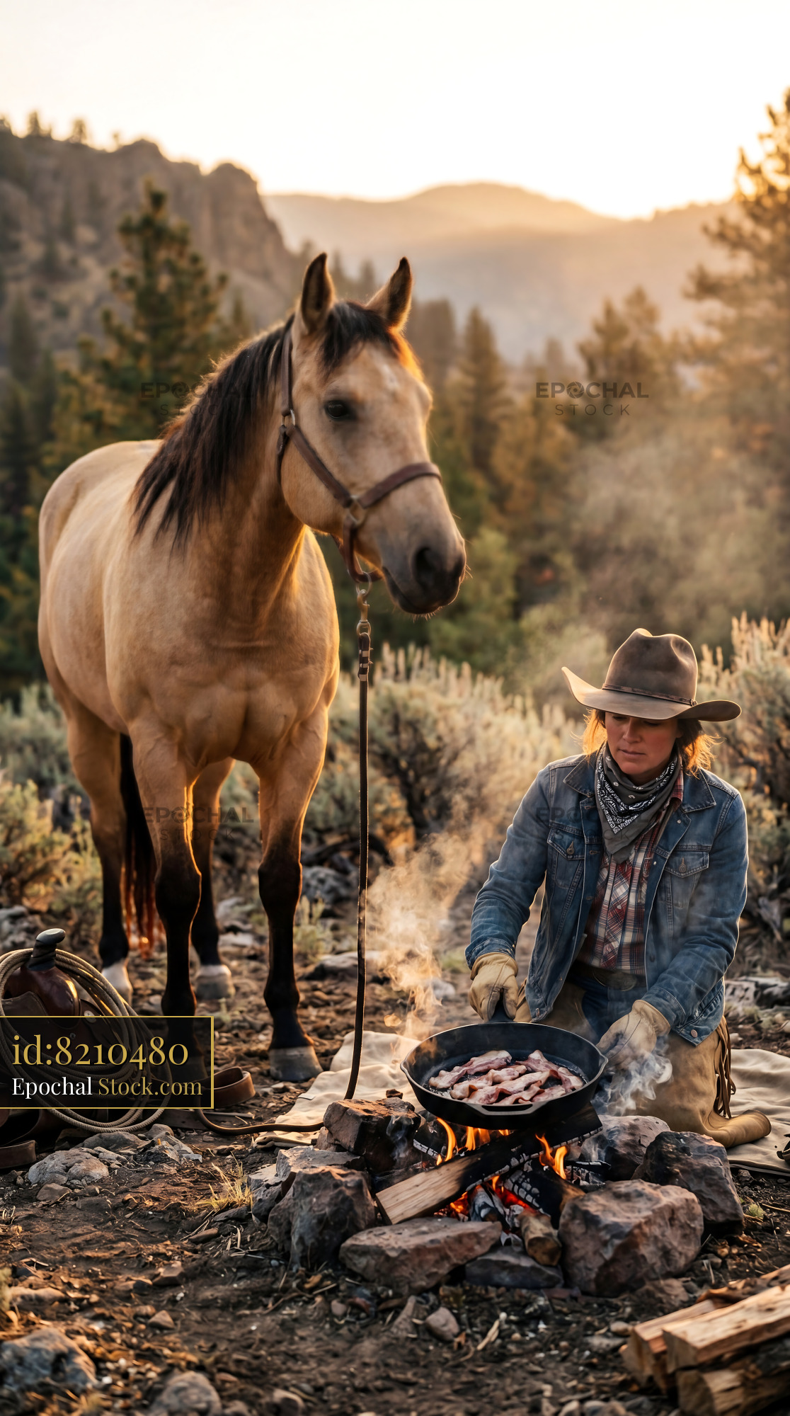 A rustic western scene featuring a cowgirl cooking over a campfire with her buckskin horse. Ideal for ranch home decor, quilting fabric, and unique wallpaper.