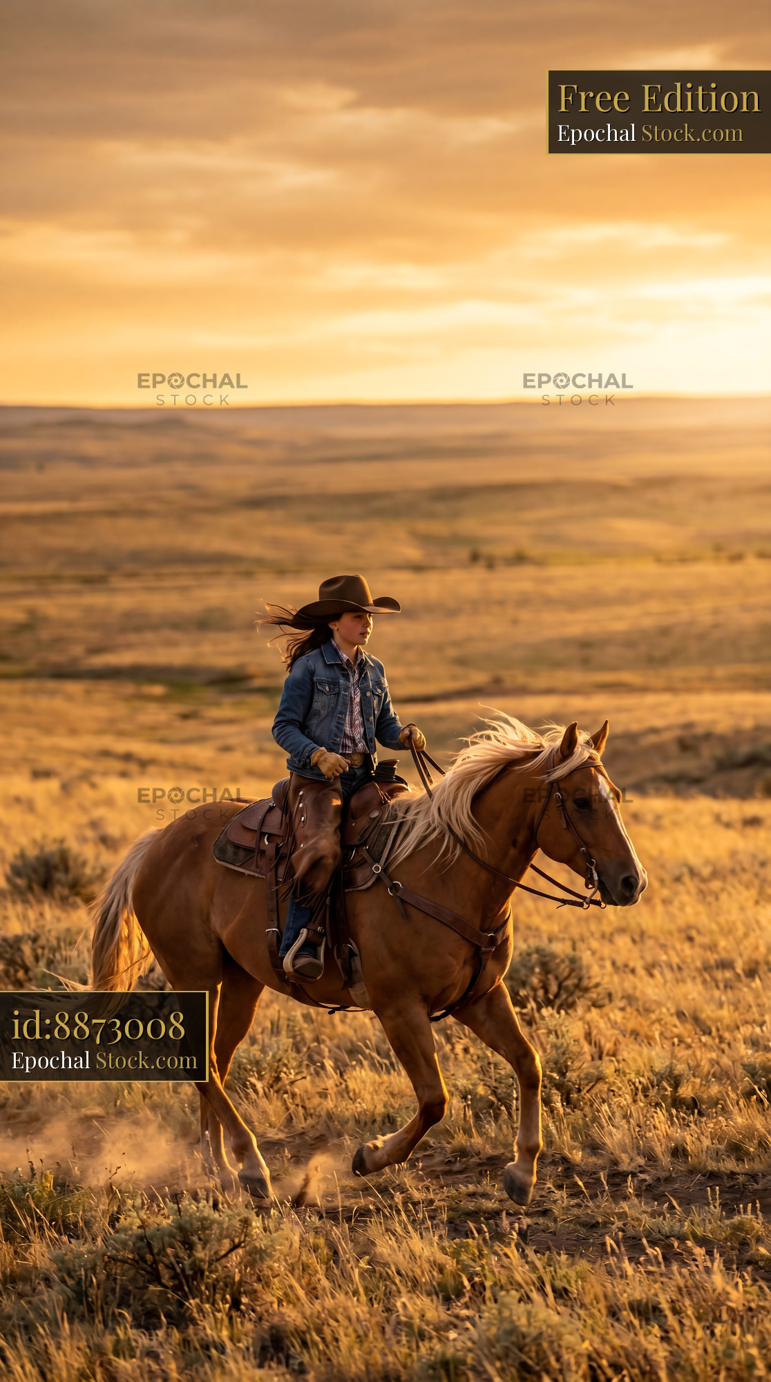 Capture the spirit of the high plains with this sunset cowgirl scene. Ideal for western-themed nursery wallpaper, rustic home decor, and equestrian quilting fabric.