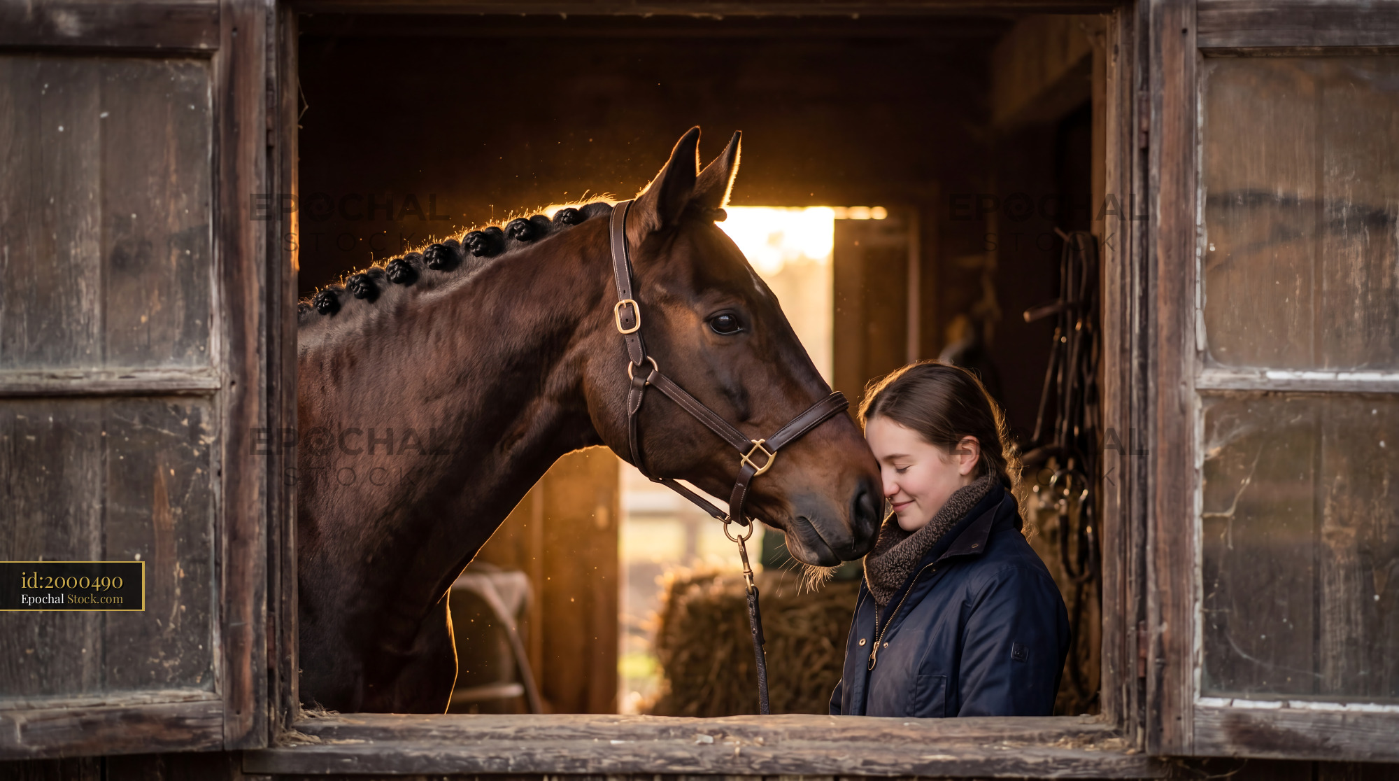 A heartwarming scene of a bay horse nuzzling a young rider at sunset. Perfect for equestrian nursery wallpaper, quilting fabric, or rustic home decor accents.