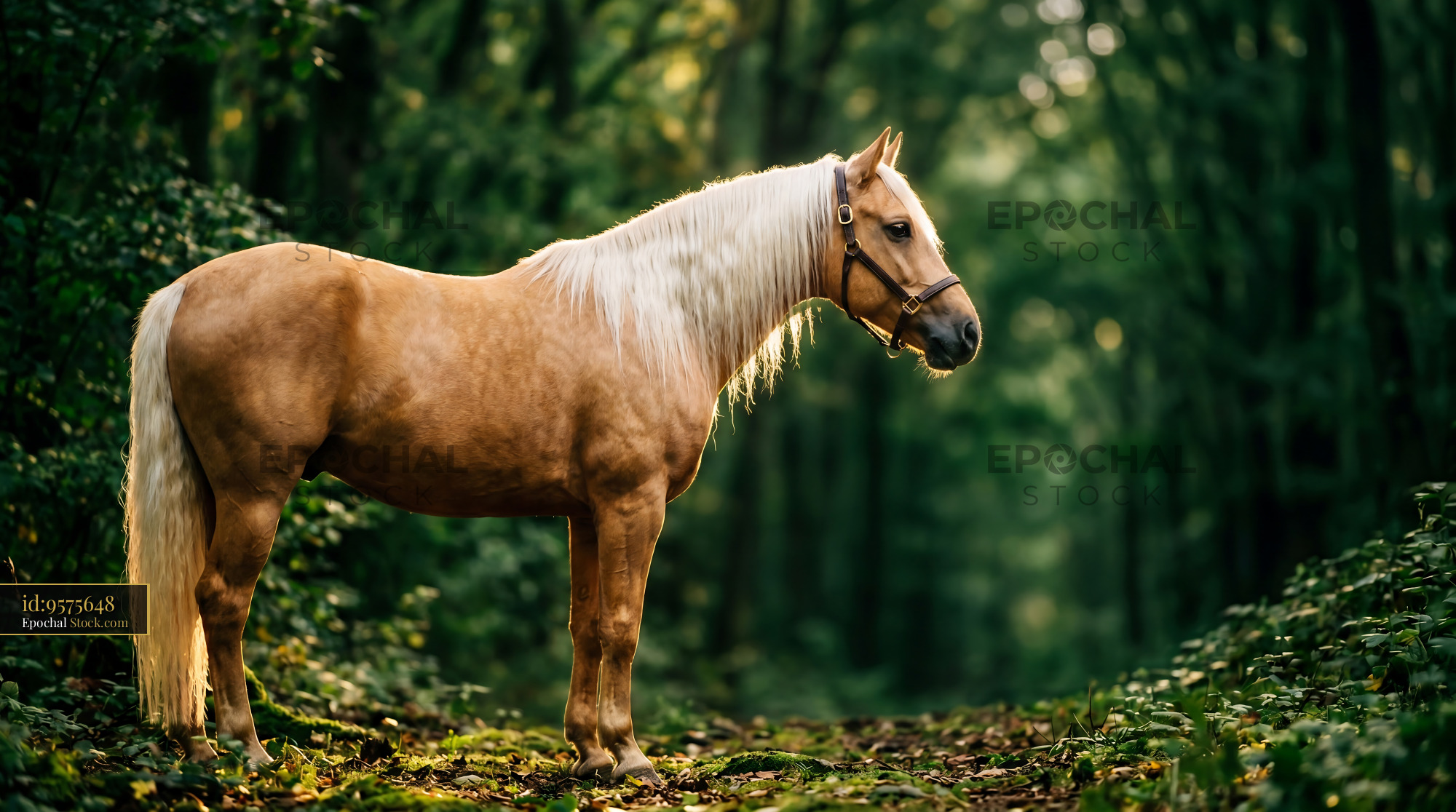 An elegant palomino horse pattern with a glowing golden coat against a deep forest. Ideal for equestrian home decor, nursery wallpaper, and quilting fabric.