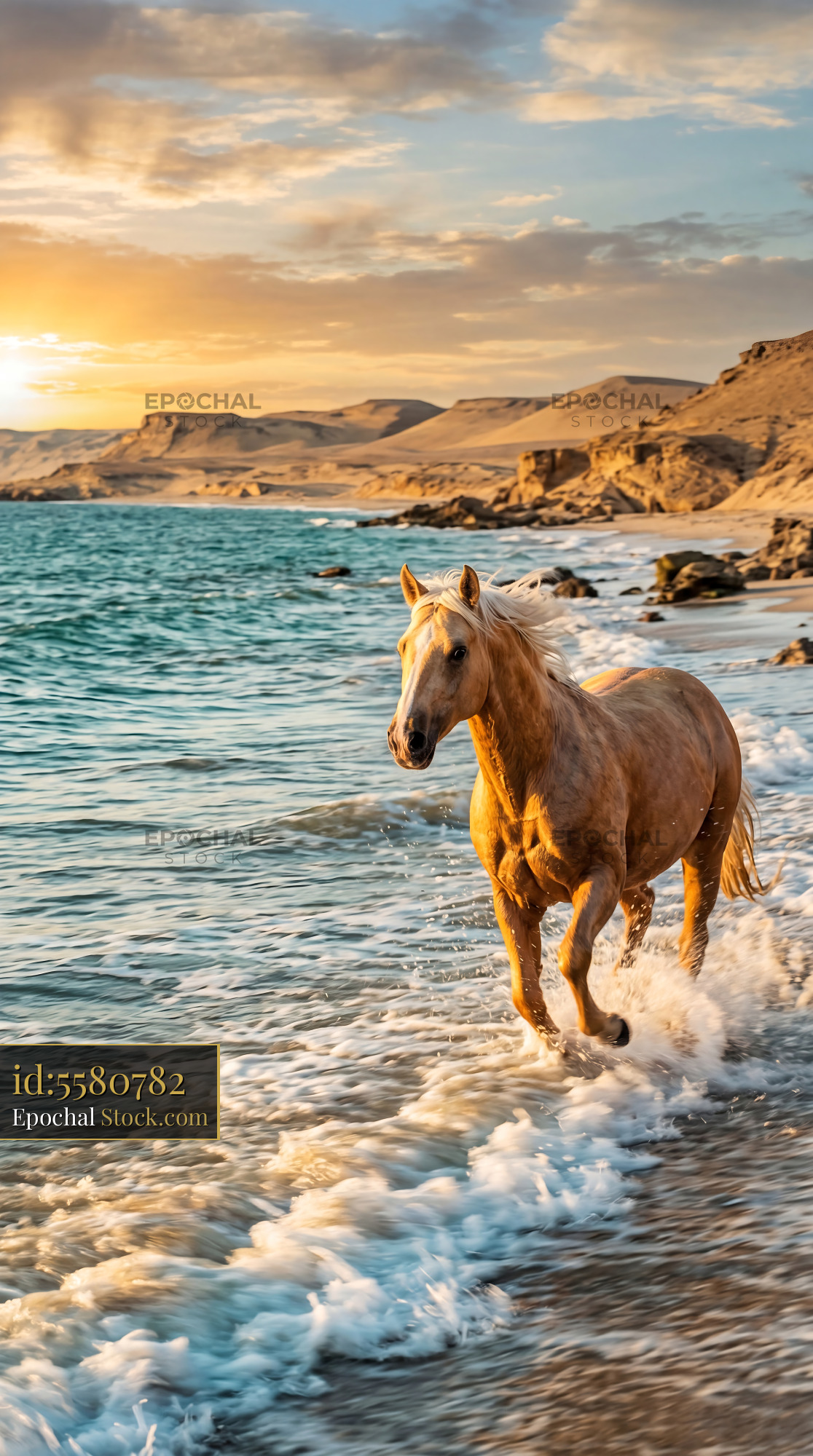 A majestic palomino horse gallops through turquoise waves at sunset. Ideal for equestrian nursery wallpaper, coastal home decor, or custom apparel fabric.