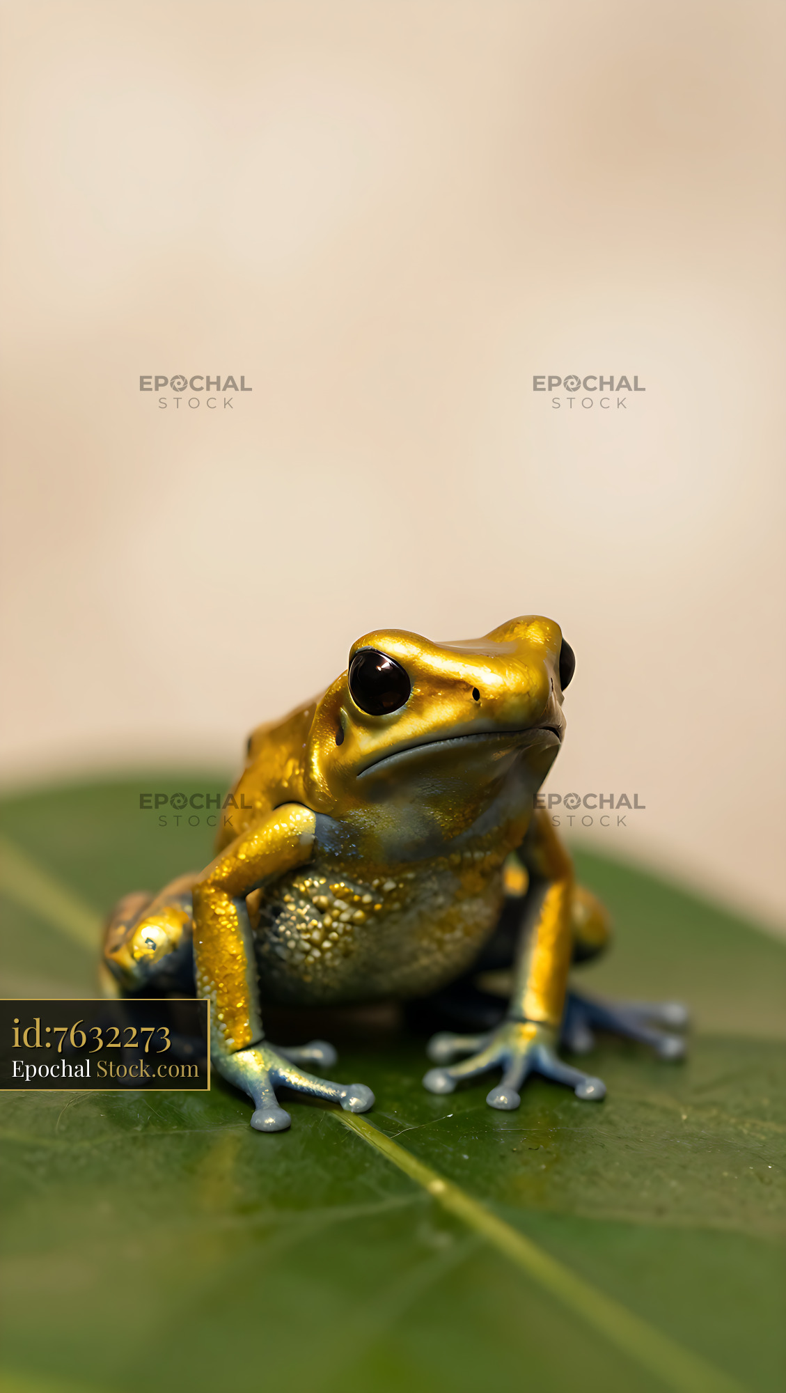 A close-up portrait of a vibrant golden poison frog perched on a lush green leaf, highlighting its unique metallic skin texture and intense gaze in a natural tropical environment.