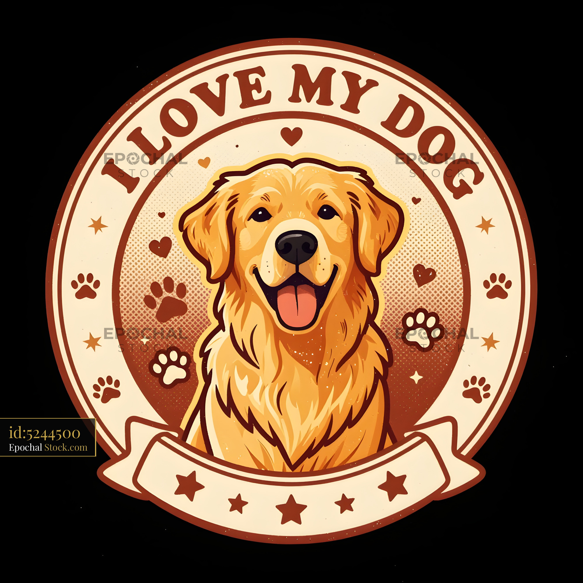 A circular design shows a golden retriever with a happy face. The words I love my dog are displayed around the dog. It features hearts and paw prints in a simple style.