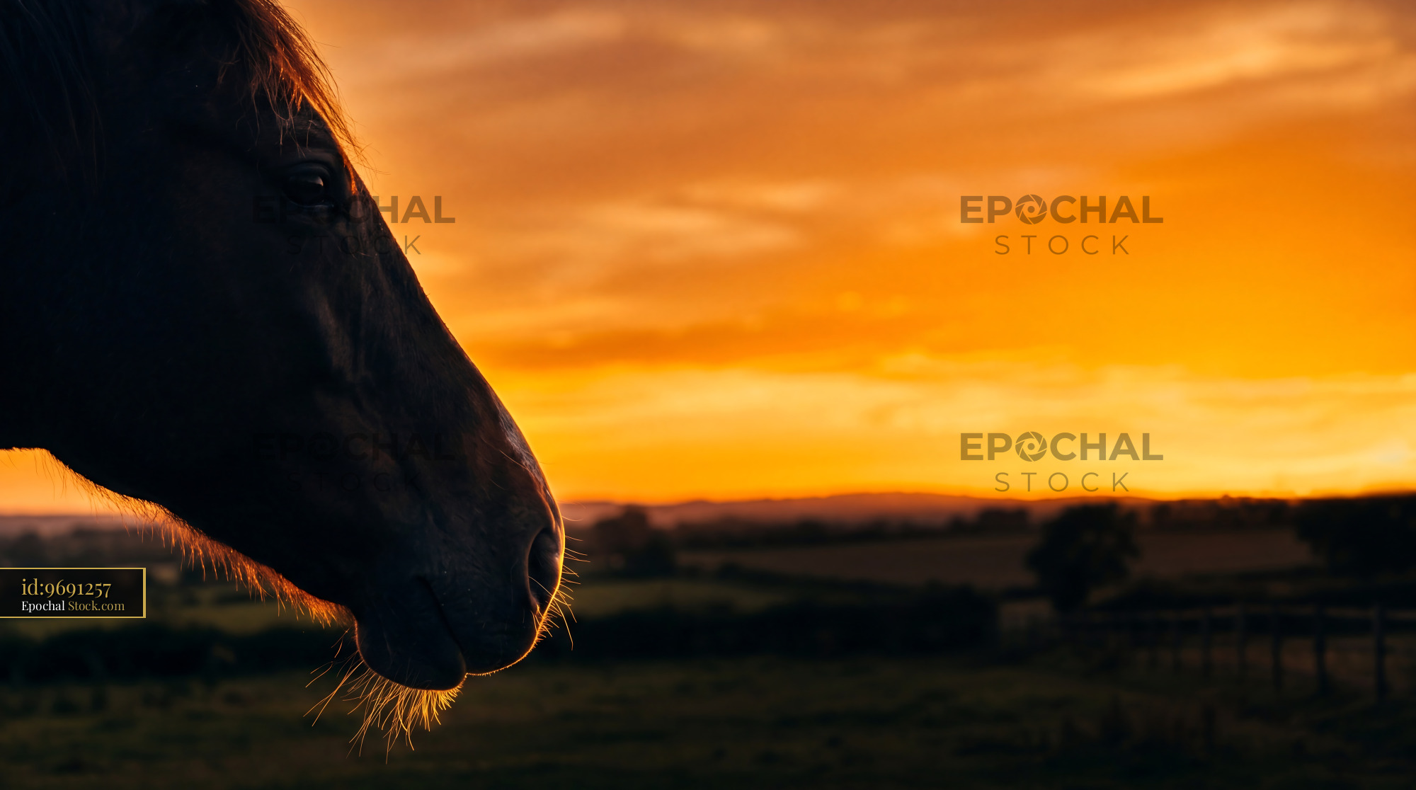 A serene equestrian pattern featuring a glowing rim-lit horse profile against a vivid orange sunset. Perfect for rustic home decor, upholstery, or statement wallpaper.