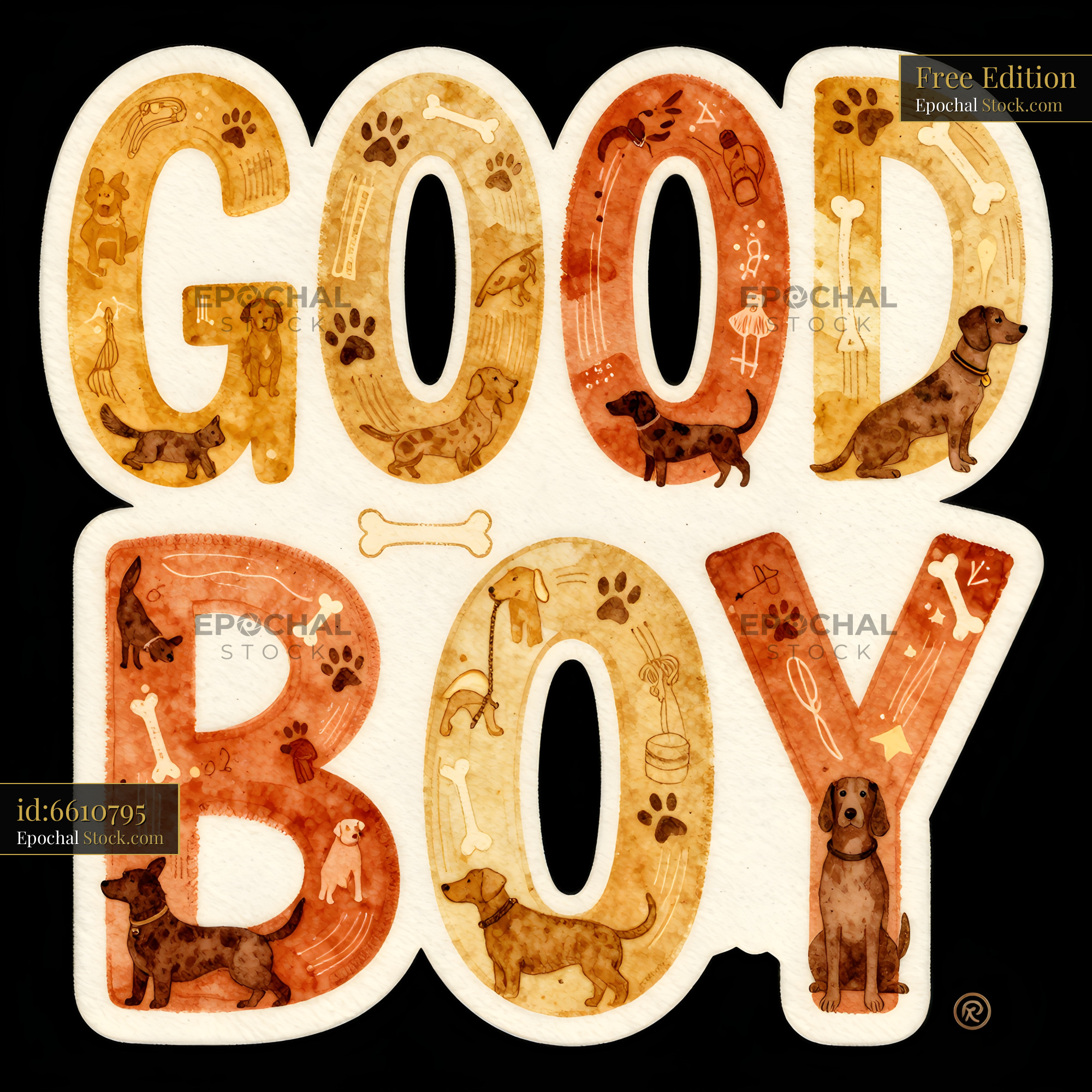The design shows the words good boy in large letters with different dogs playing and resting around the text. The background is simple and allows the colors to stand out.