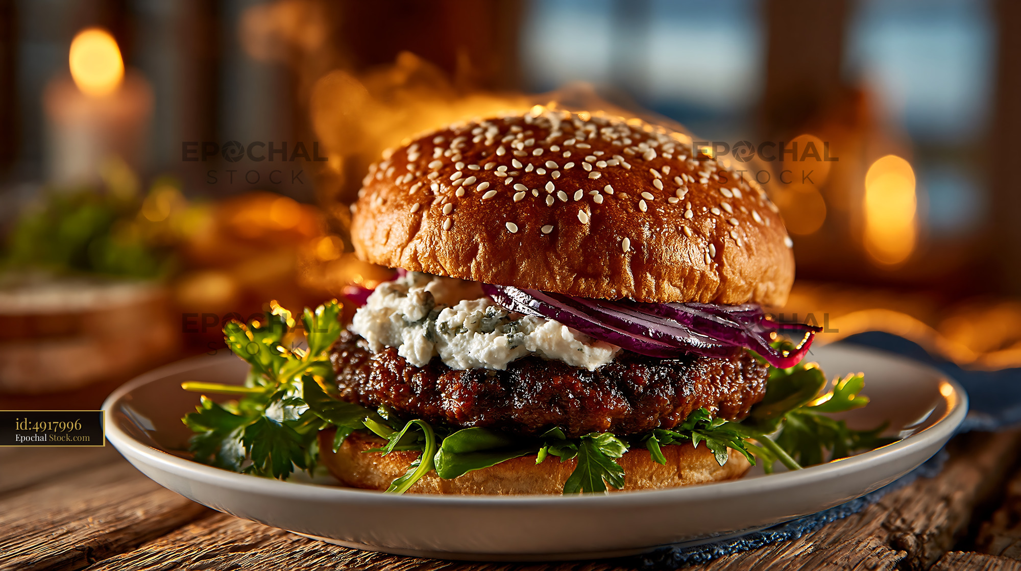 An artfully plated gourmet burger features a perfectly seared beef patty topped with creamy goat cheese, roasted purple onion, and fresh parsley, served on a seeded brioche bun. Warm golden lighting and blurred bokeh create an upscale dining atmosphere, showcasing culinary craftsmanship and premium burger artistry.