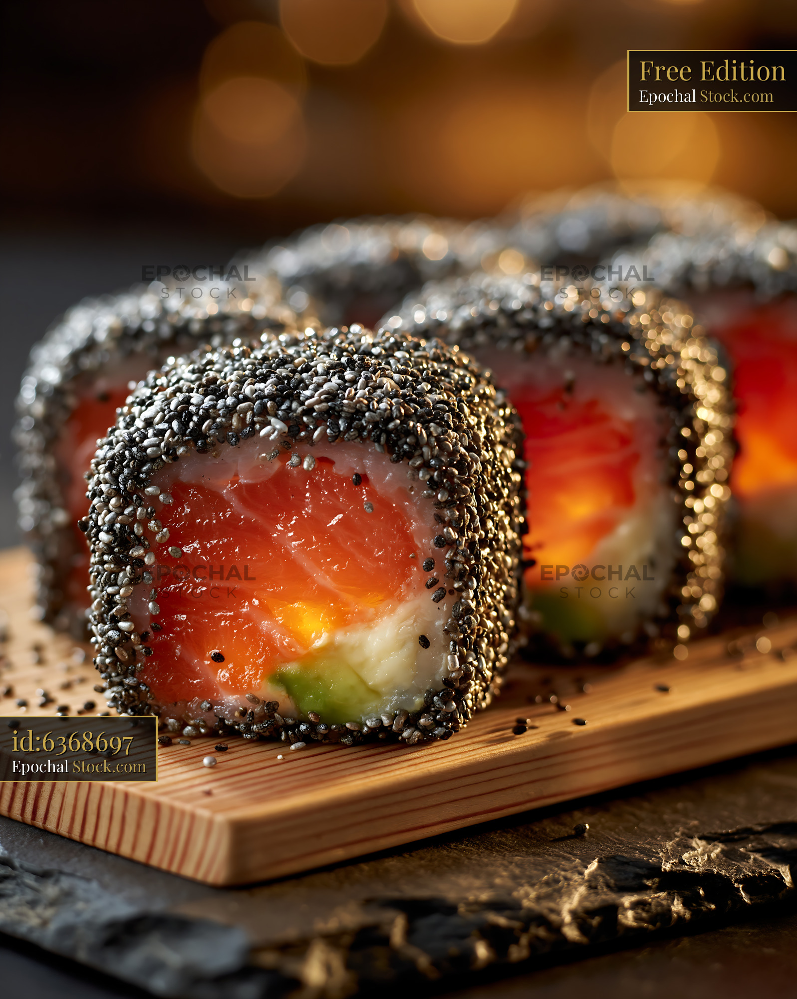 Innovative uramaki sushi rolls coated in black chia seeds, featuring vibrant salmon and avocado, presented on a wooden platter under warm atmospheric lighting.